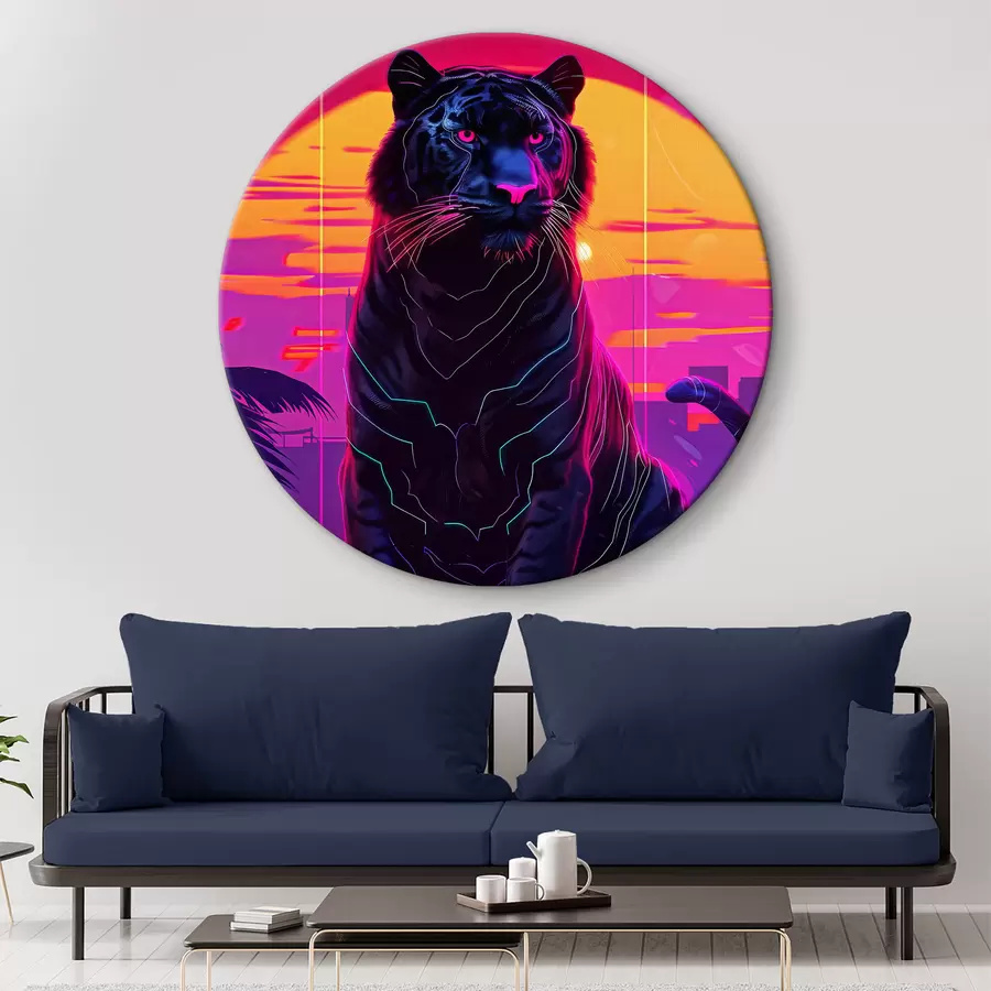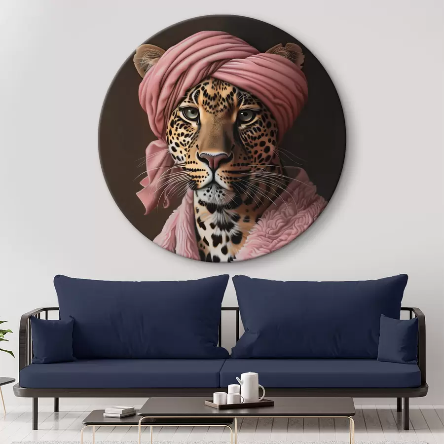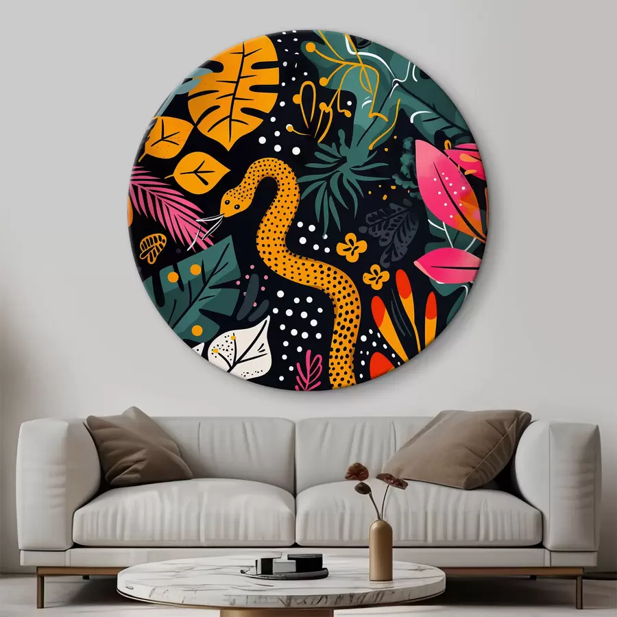 Leopardo žvilgsnis: drąsi kompozicija su vasariškais palmių lapais ryškiai raudoname fone