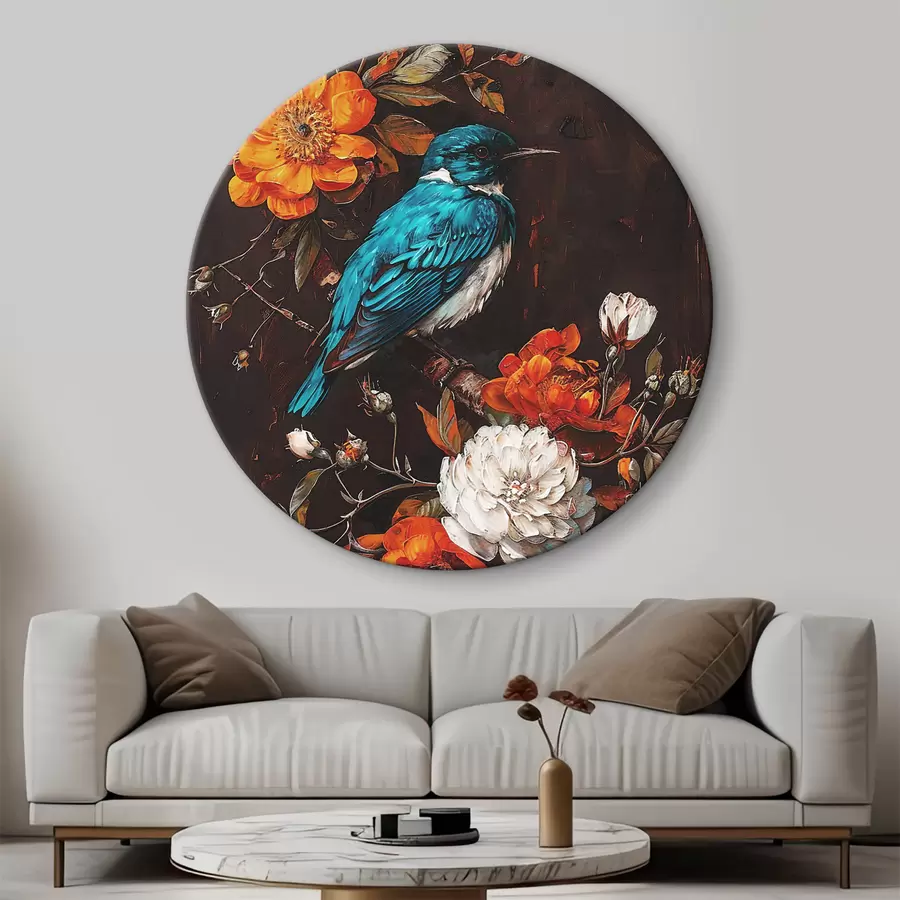 Paukštis sėdi ant šakos su žydinčiomis gėlėmis, mėlynos, rožinės, raudonos, oranžinės, geltonos spalvos