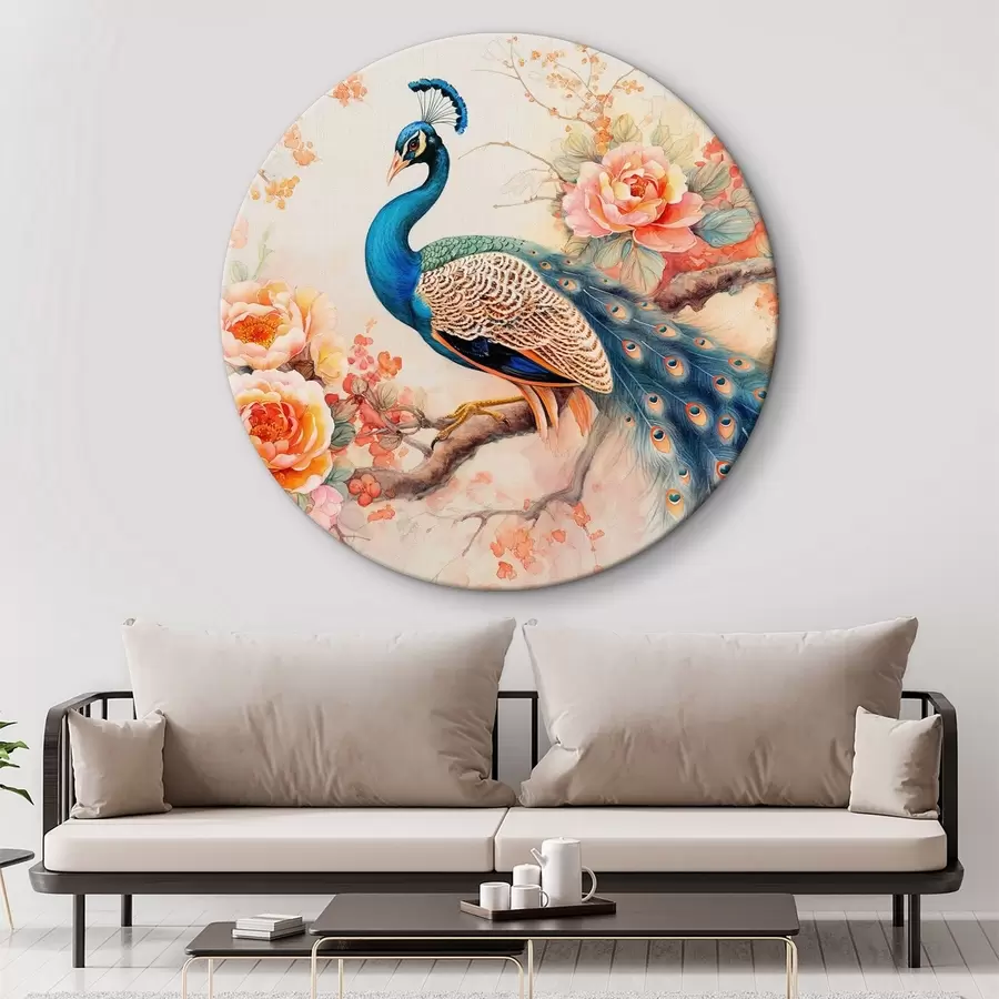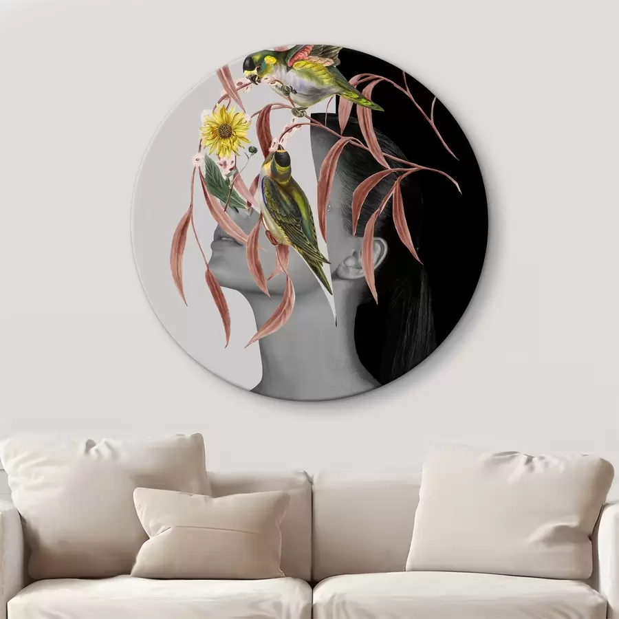 Spalvingi paukščiai ant šakos švelniame pastelinių spalvų fone