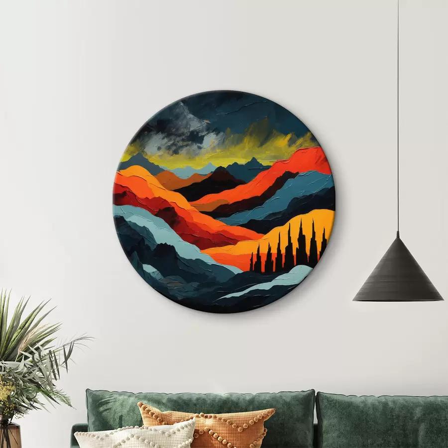 Saulėtekis virš geometrinio kalnų kraštovaizdžio