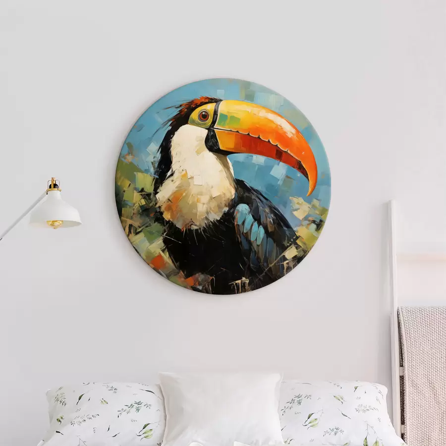 Tukano paukštis mėlynai žaliame fone, teptuko potėpių imitacija