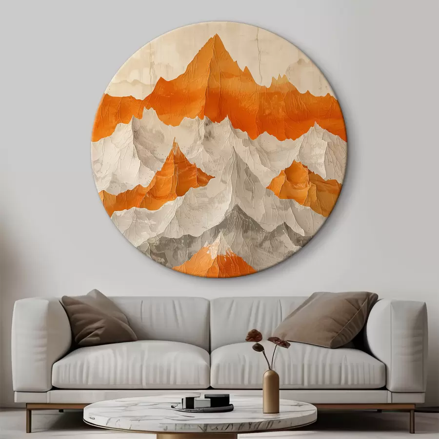 Abstrakčios oranžinės ir smėlio spalvos kalnų grandinės: trompe-l'oeil su skulptūrinėmis detalėmis