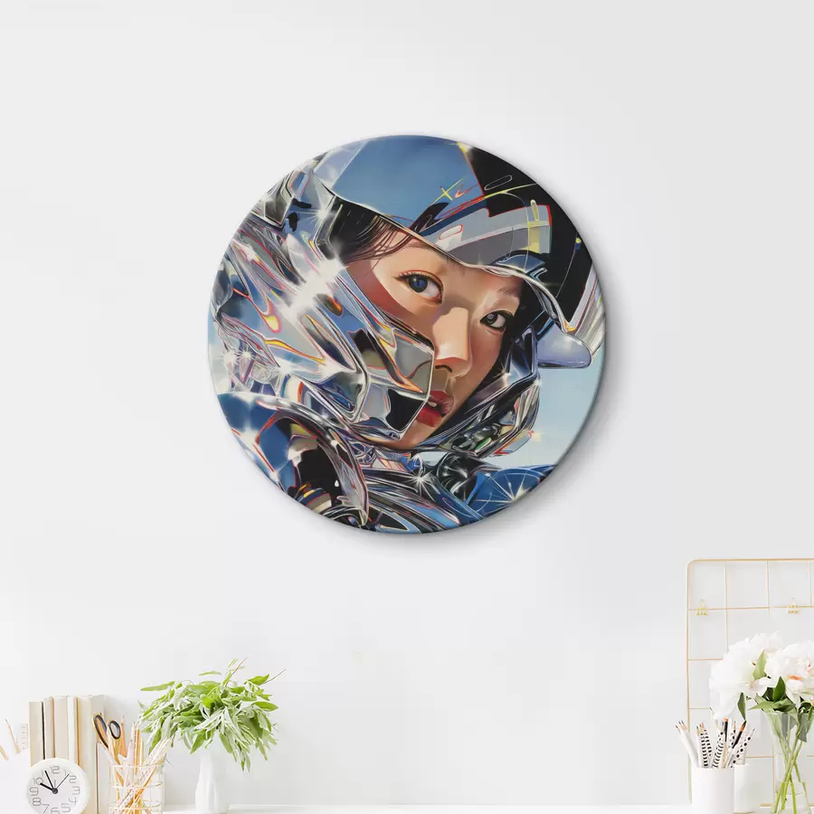 Minimalistinis paveikslas, vaizduojantis moterį ilgais, tamsiais, banguojančiais plaukais, sušukuotais į elegantišką kuodą, vilkinčią baltą chalatą