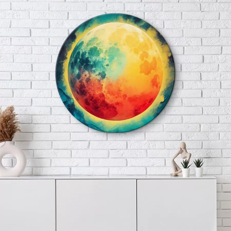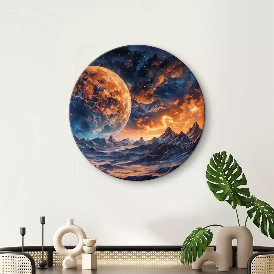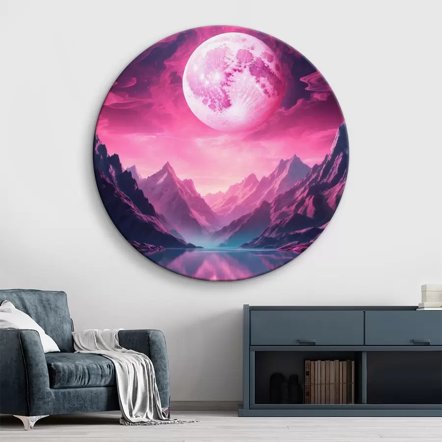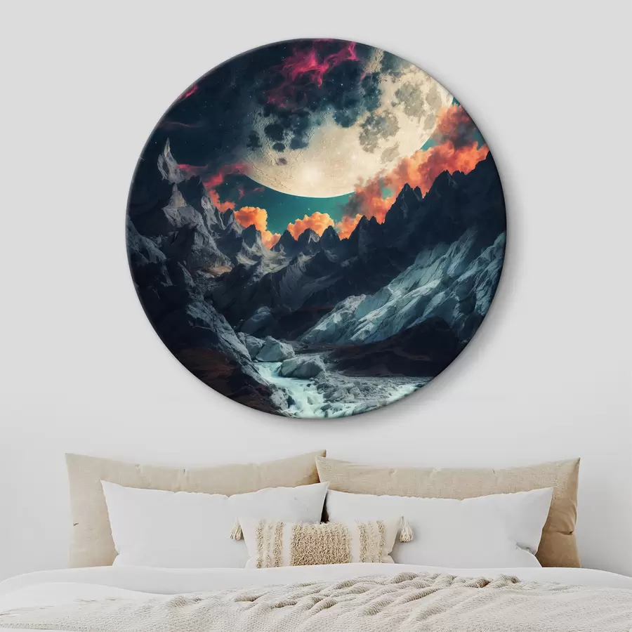 Įvairiaspalviai kalnai mėnulio fone akrilo tapybos stiliumi