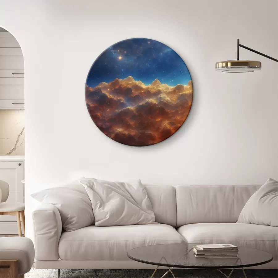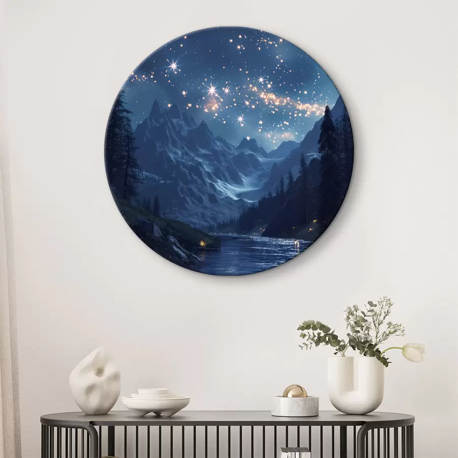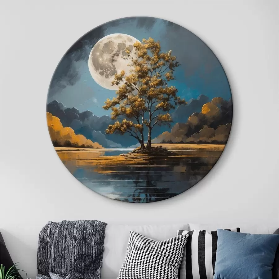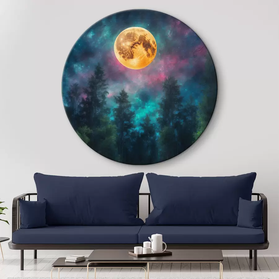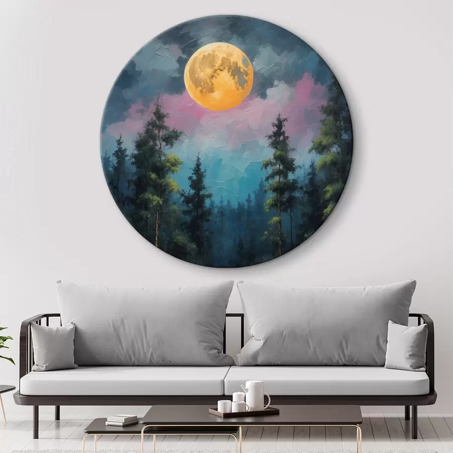Įvairiaspalviai kalnai mėnulio fone akrilo tapybos stiliumi