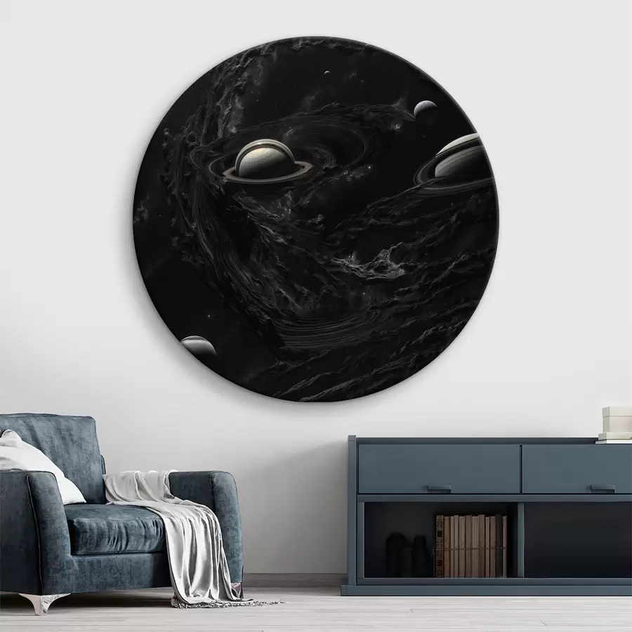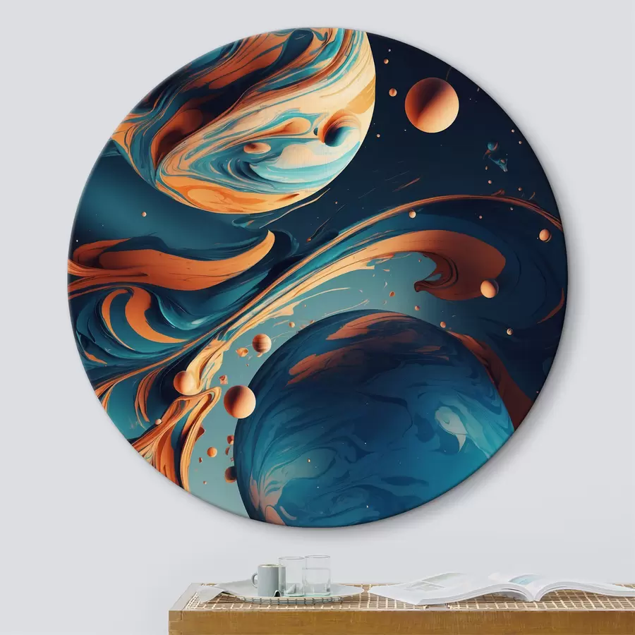 Abstraktaus planetos su oranžinėmis gyslomis juodame kosmoso fone, modernus minimalistinis menas