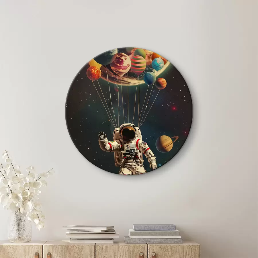 Astronautas skrieja asteroidu su mėnuliu fone, mėlynos, raudonos ir oranžinės spalvos