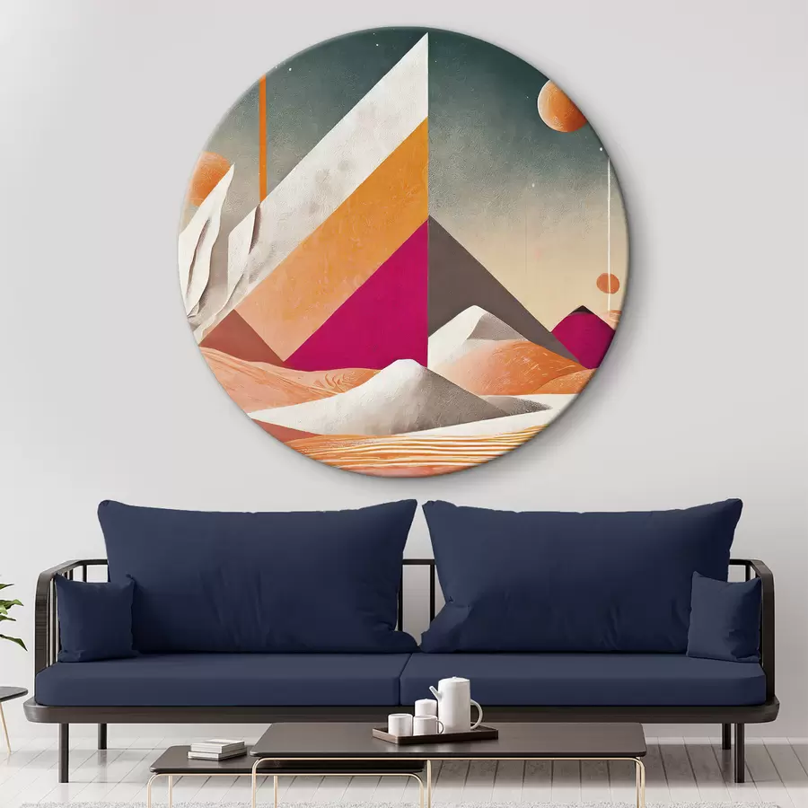 Geometrinis menas, abstrakcija, rožinė ir oranžinė, kosminis, dykuma su uolomis