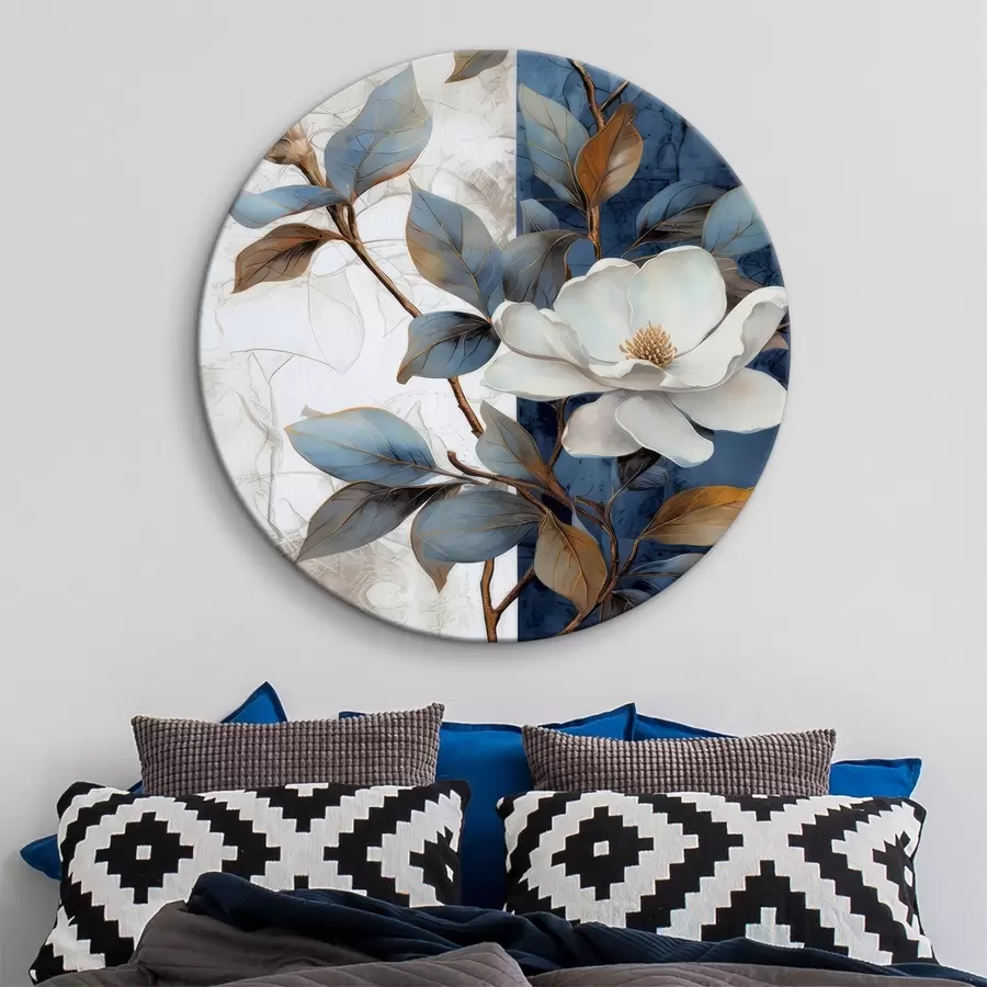 Ant žydinčios šakos sėdintys žvirbliai aliejinė tapyba, mėlyna, balta, ruda