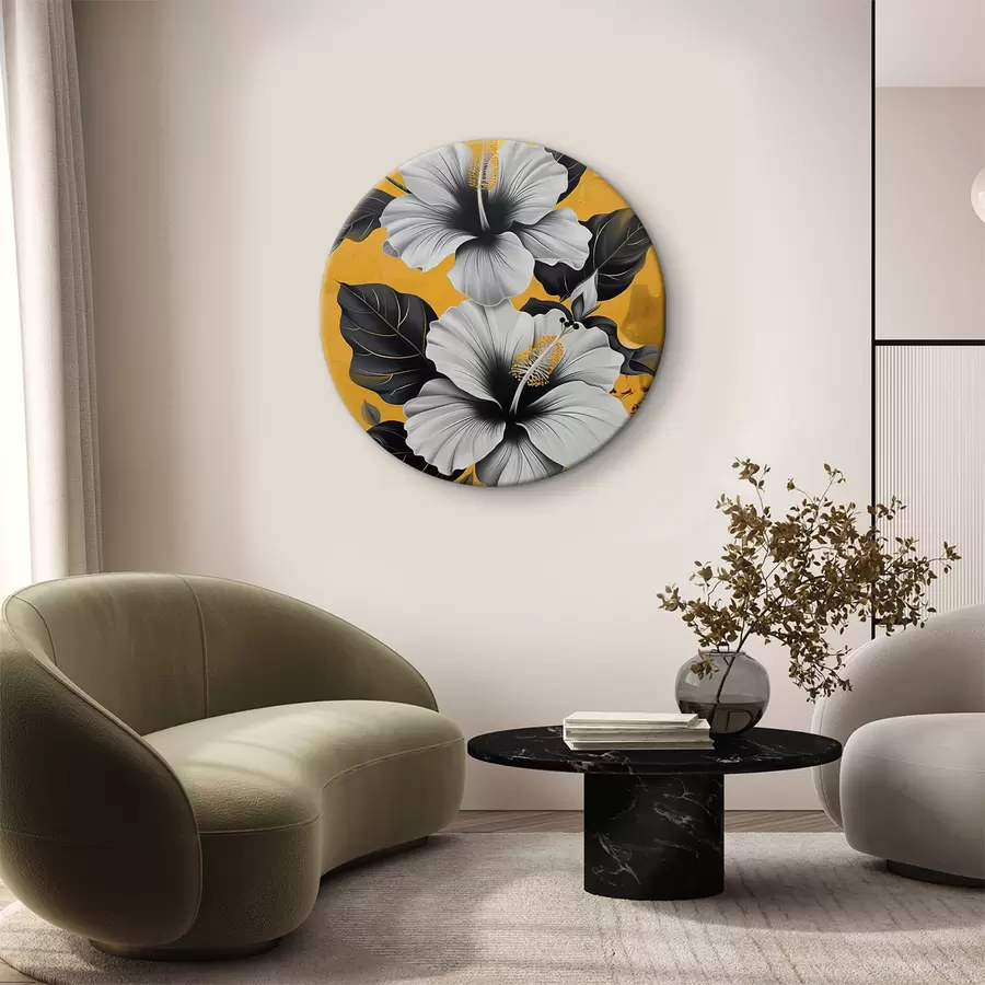 Šviesiaplaukė moteris, apsupta ryškiai oranžinių ir baltų atogrąžų gėlių, žalių lapų ir augmenijos