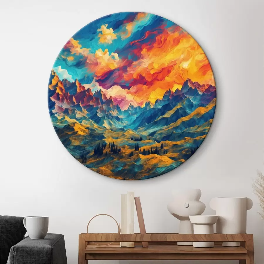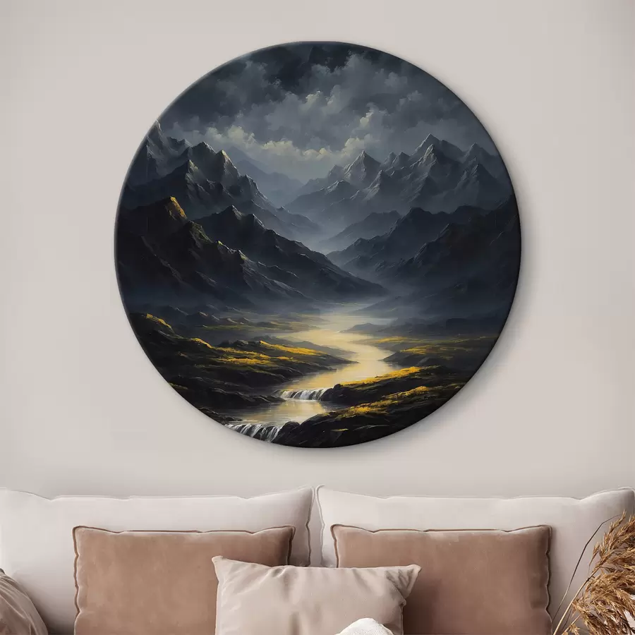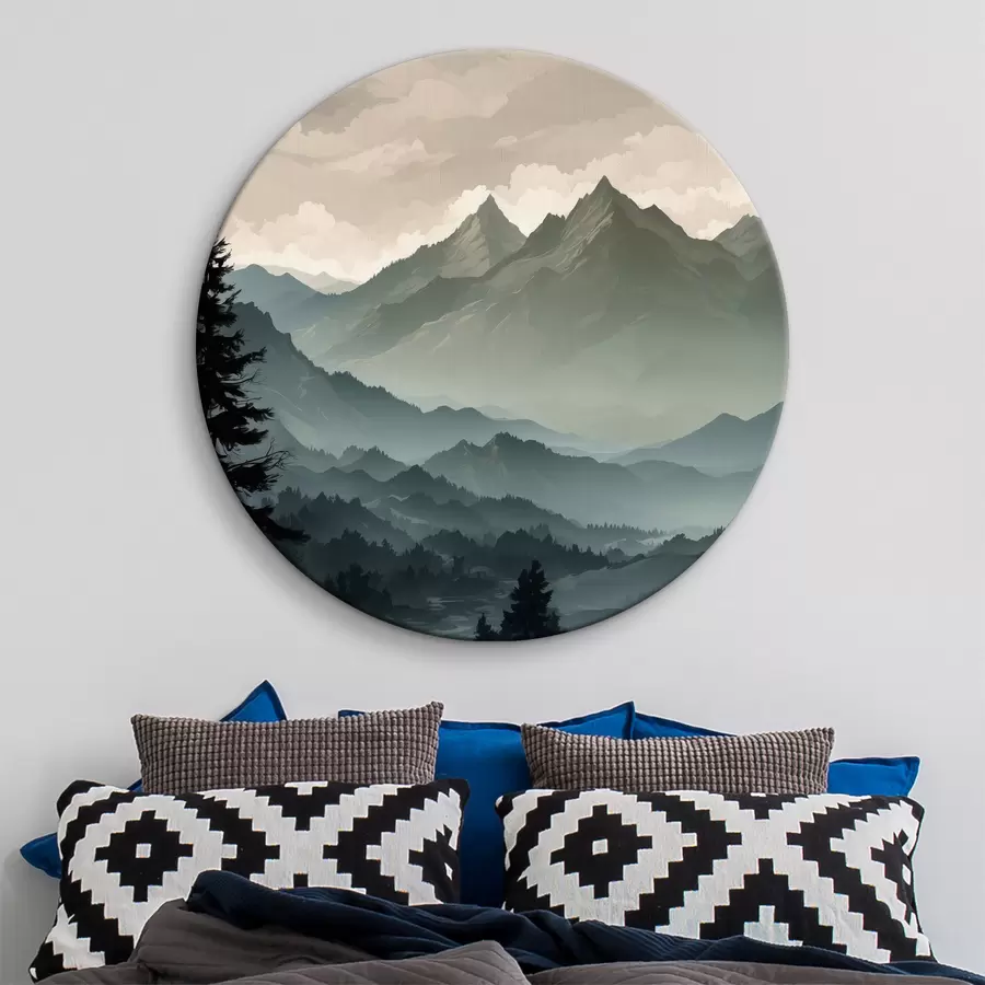 Minimalizmo kalnų peizažas su uolėtomis viršūnėmis ir smėlio spalvos kalvomis