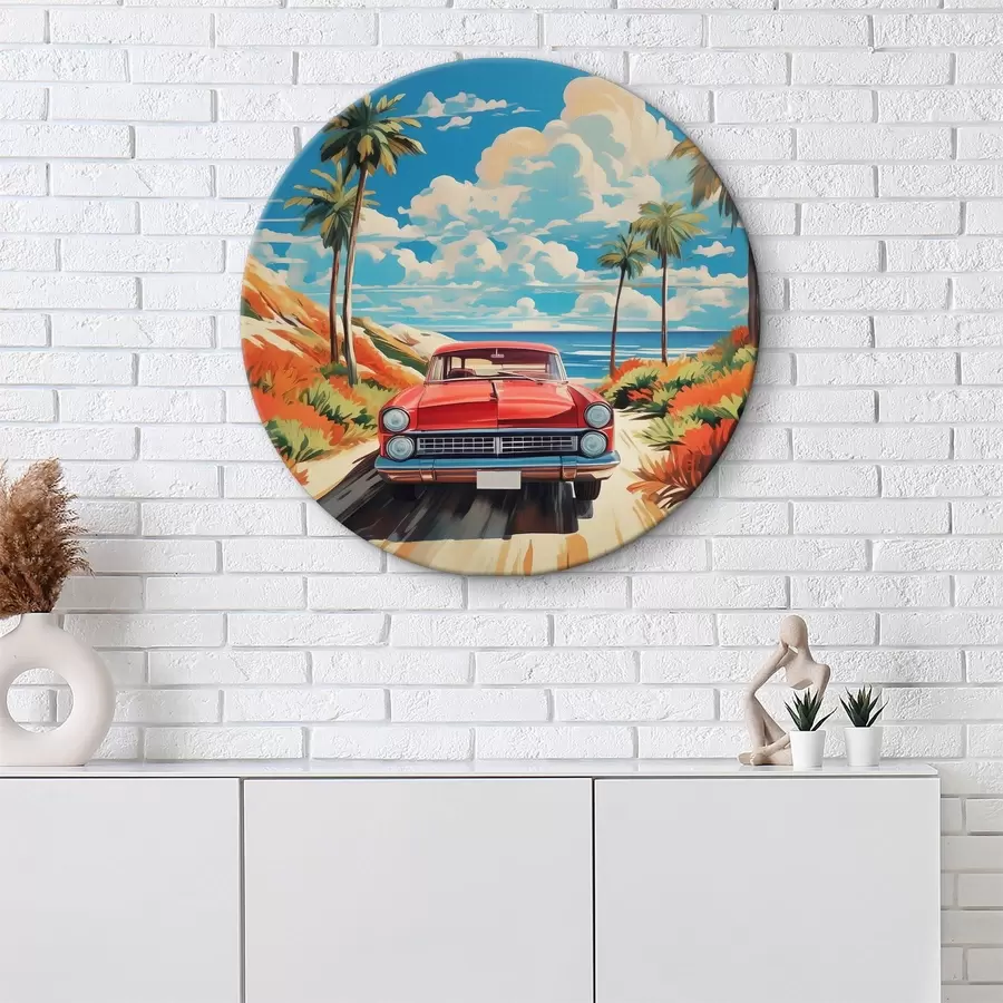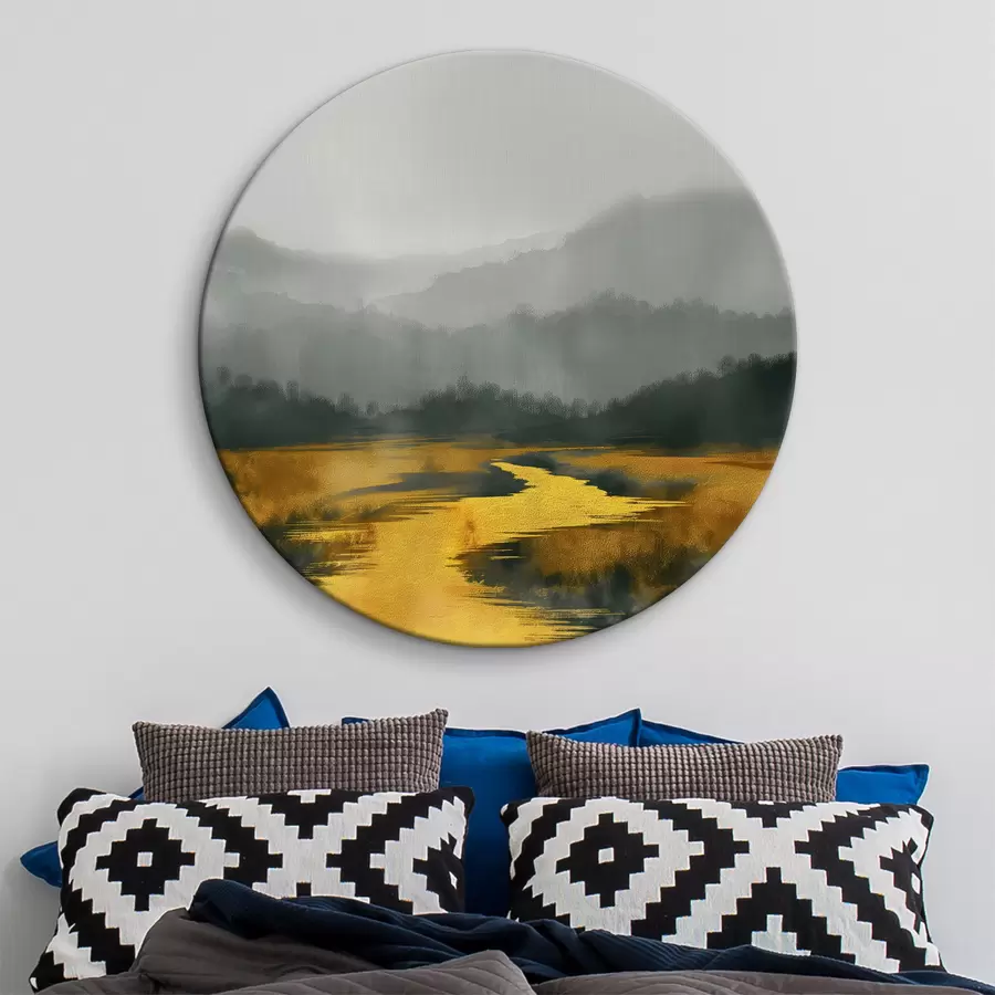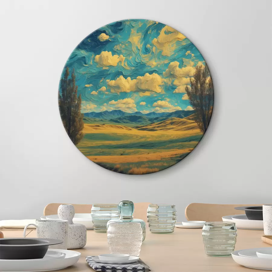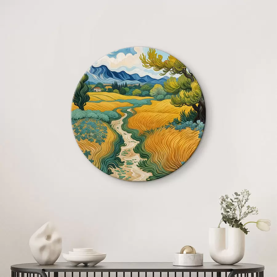 Spalvingas kraštovaizdis su vingiuotu purvo keliu, vedančiu per lauką Van Gogo stiliaus