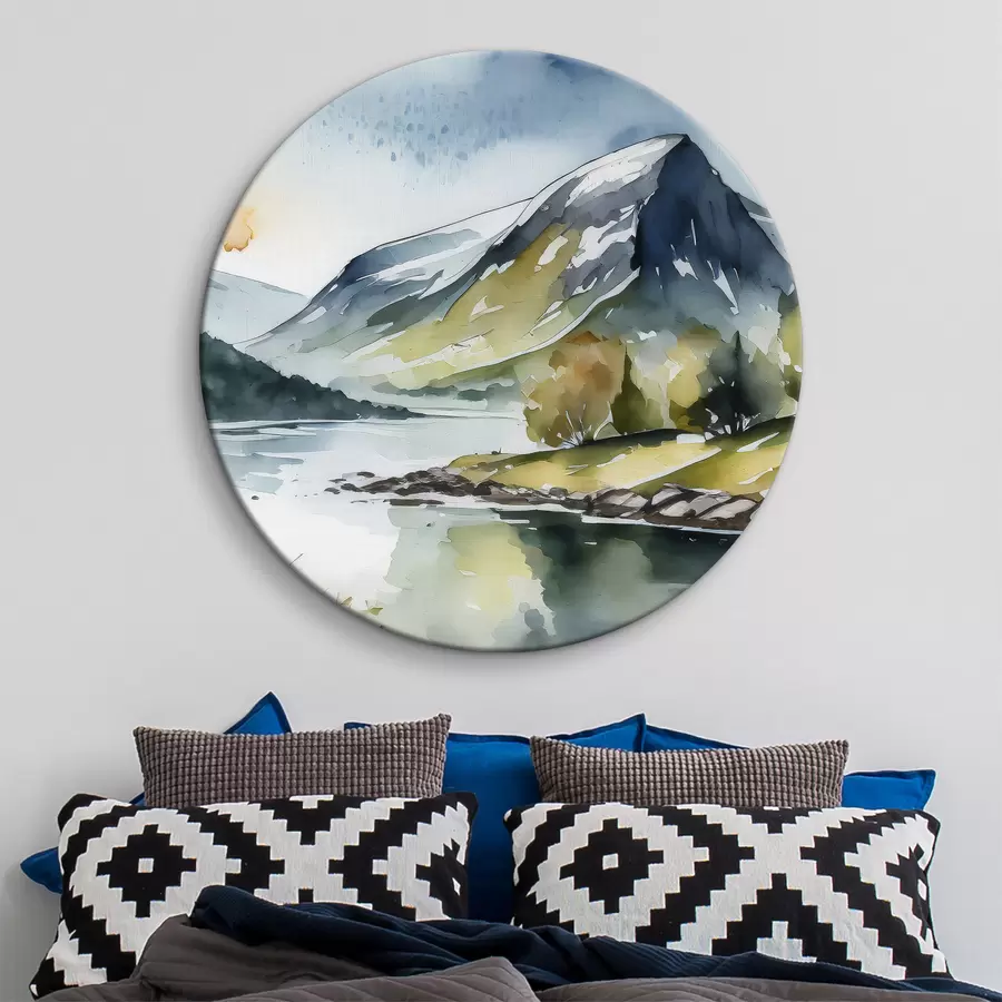 Akvarelė Kalnų kraštovaizdis, saulėtekis, minkštos violetinės, rožinės ir mėlynos spalvos