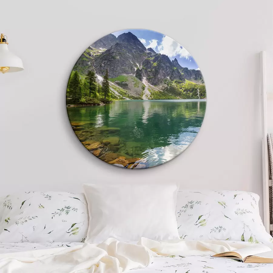 Ramus kraštovaizdis su ežeru, atspindinčiu kalnus fone su maža valtimi ant ramaus vandens