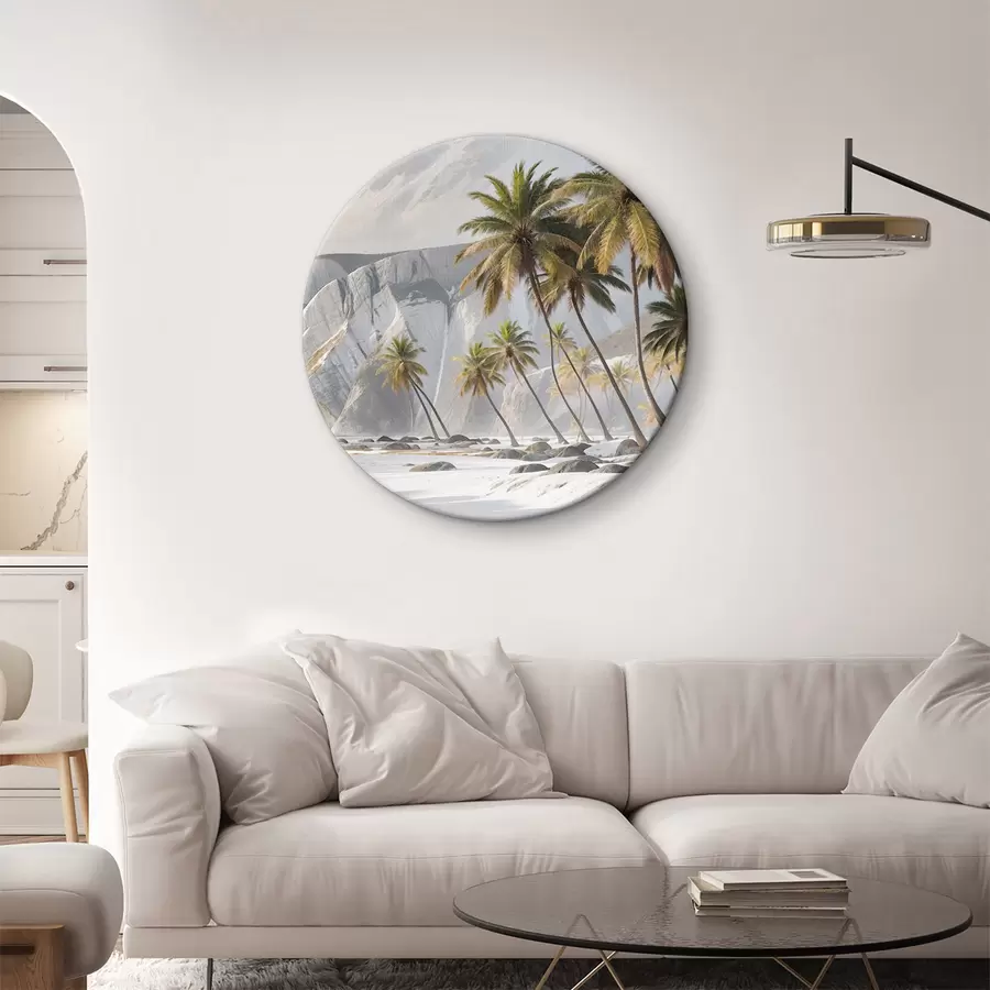 Tropinis paplūdimys su didelėmis uolėtomis uolomis, palmėmis ir ramiu vandenynu su uolų abstraktaus meno atspindžiais