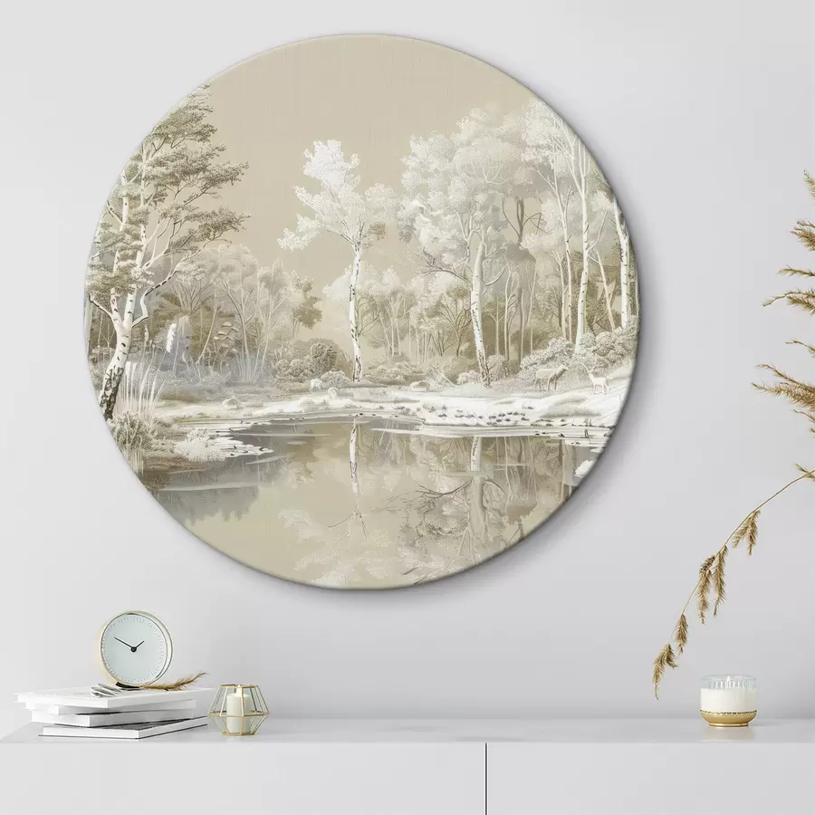 Gražus miško kraštovaizdis, tvenkinys ir medžiai, smėlio ir baltos spalvos