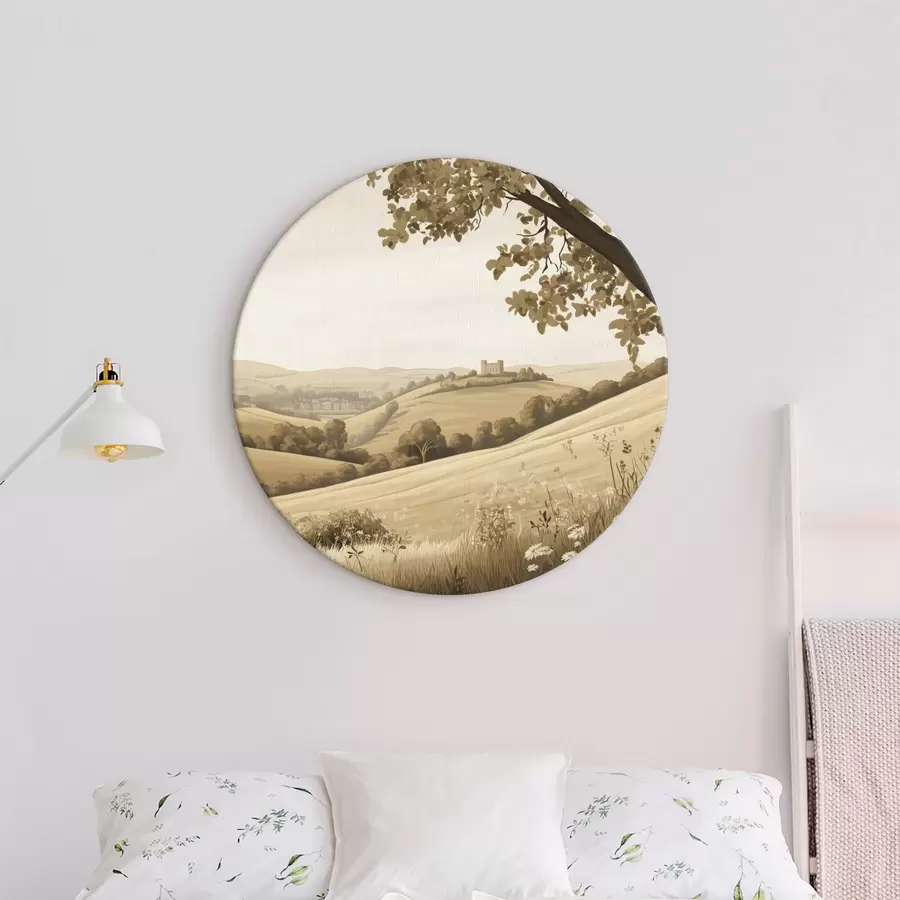 Senovinis vasaros peizažas, kaimiškas stilius, pastelinės spalvos, kalvos su medžiais, boho