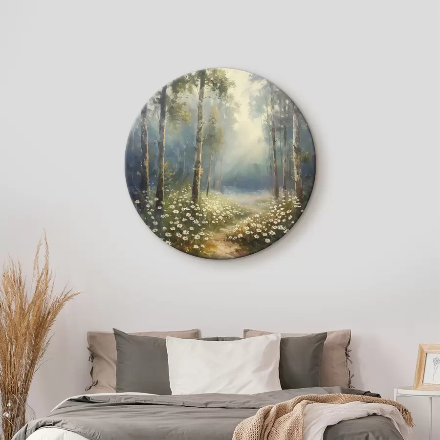 Miškas su beržais ir ramunėlių žiedais, švelni saulės šviesa, natūralios spalvos, pastelinė