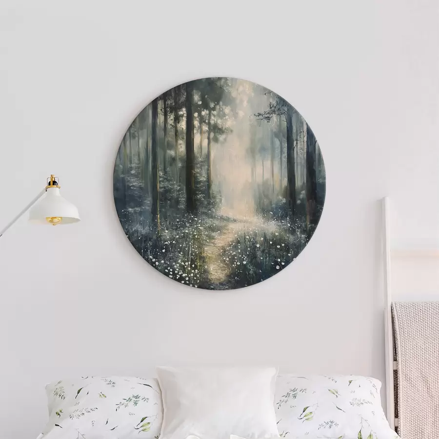 Tankus miškas su saulės spinduliais medžiuose, baltos gėlės, žalia žolė, aliejinė tapyba
