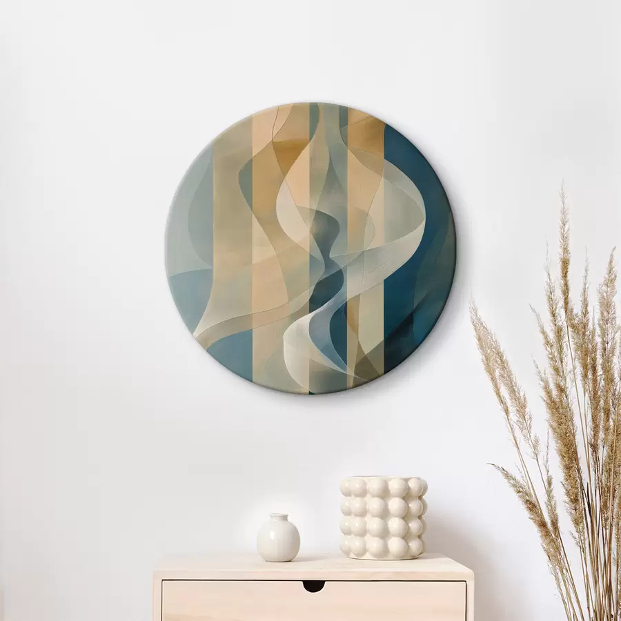 Abstrakčios geometrinės formos mėlynais, oranžiniais ir rudais atspalviais sukuria modernią, minimalistinę kompoziciją.