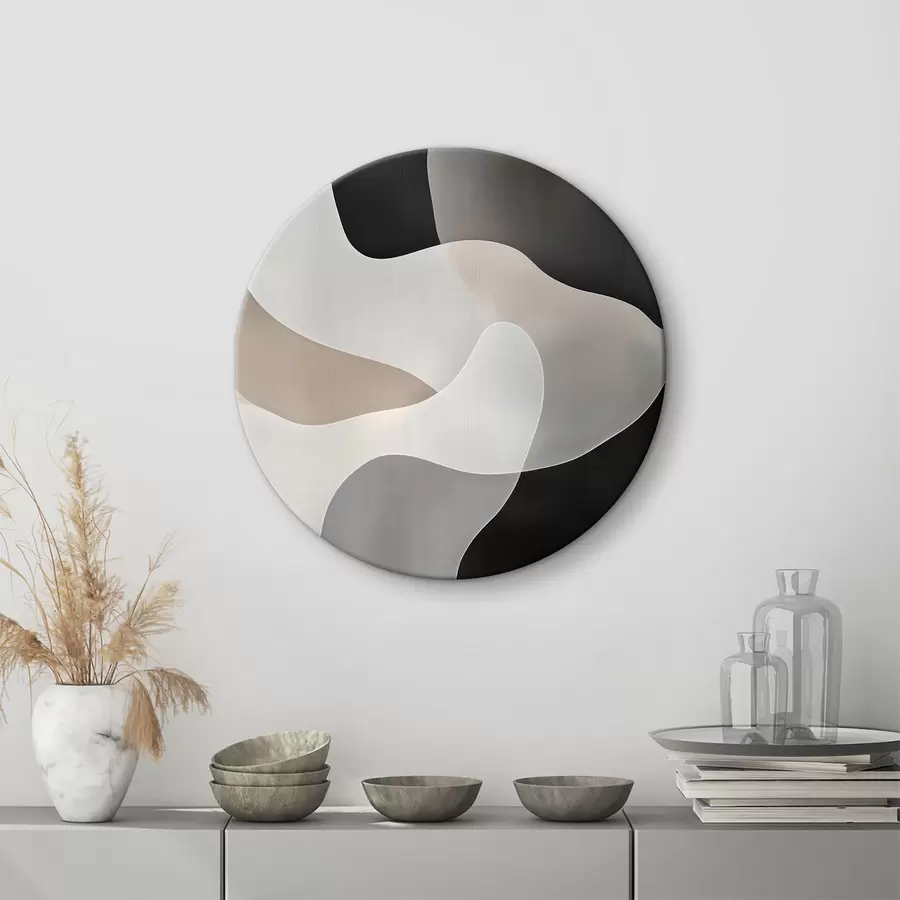 Abstrakti šiuolaikinė geometrinė kompozicija su persidengiančiomis formomis ir pilkų, juodų ir smėlio atspalvių spauda