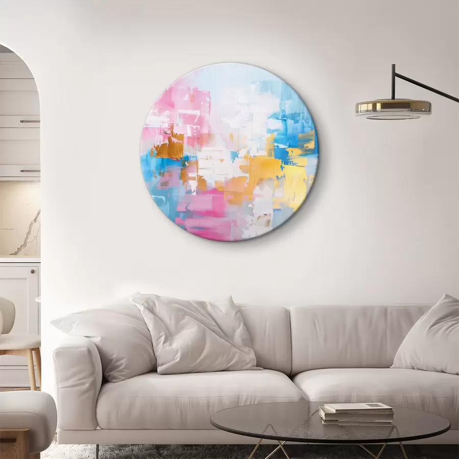 Abstraktus ekspresionizmas dideliais rožinės, geltonos ir baltos spalvos dažų potėpiais
