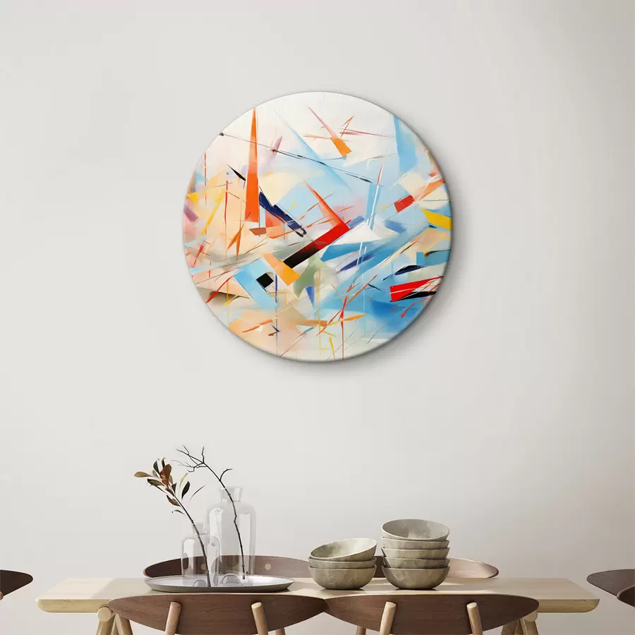 Chaotiška dinamiška geometrinė abstrakcija, mėlyna, raudona, geltona