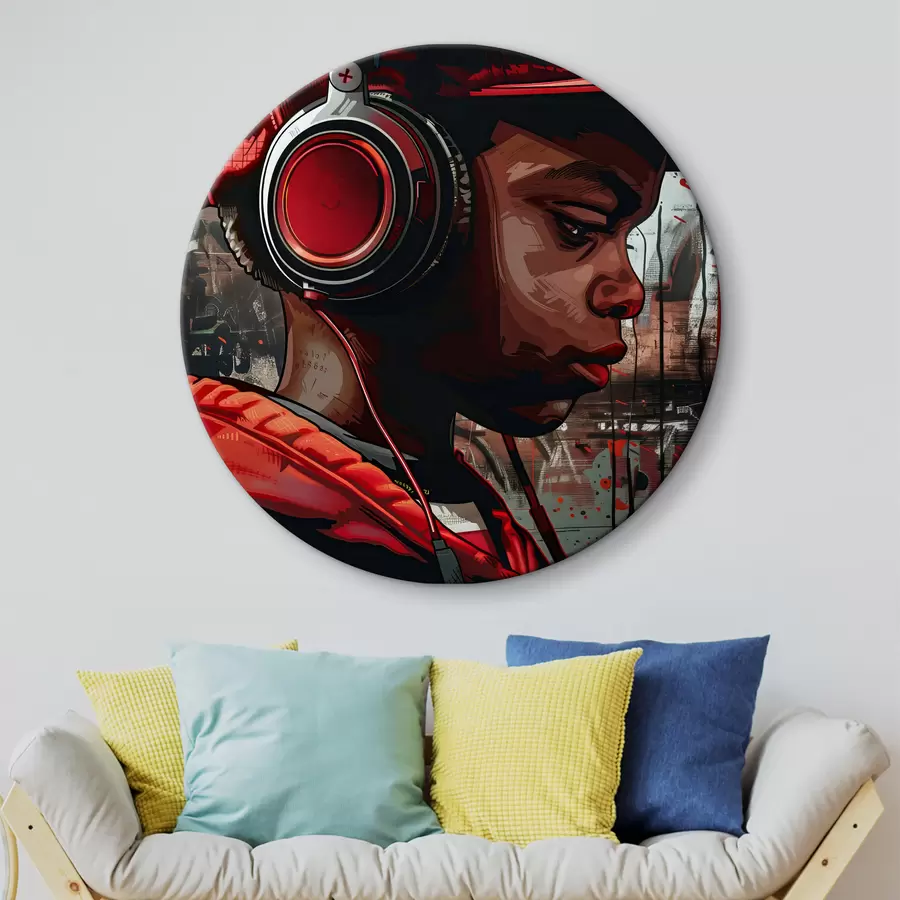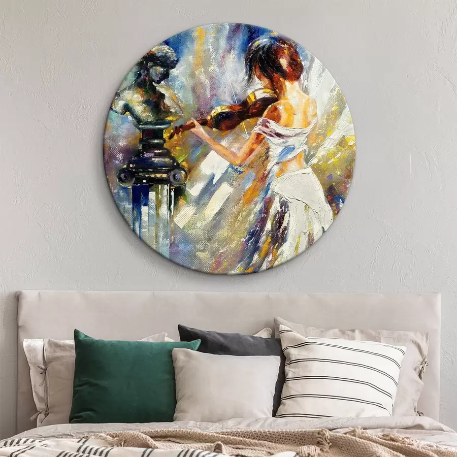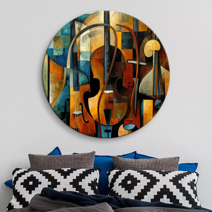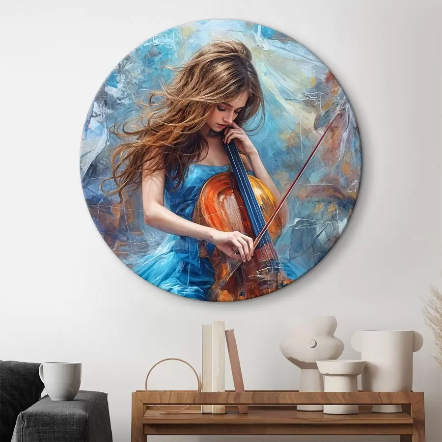 Aliejinės tapybos menas, kuriame jauna moteris ilgais, slenkančiais raudonais plaukais groja violončele abstrakčiame fone