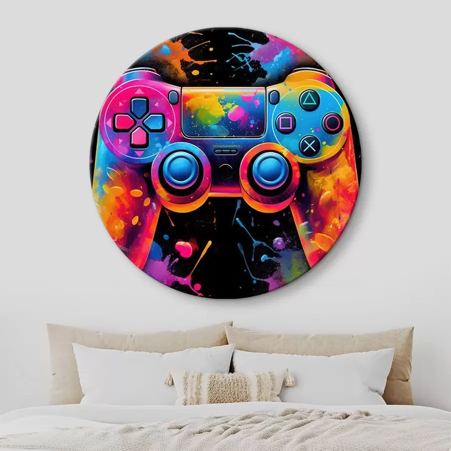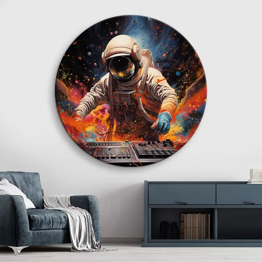 Baltas šuo su oranžiniu švarkeliu ir ausinėmis, imituojantis tapybą