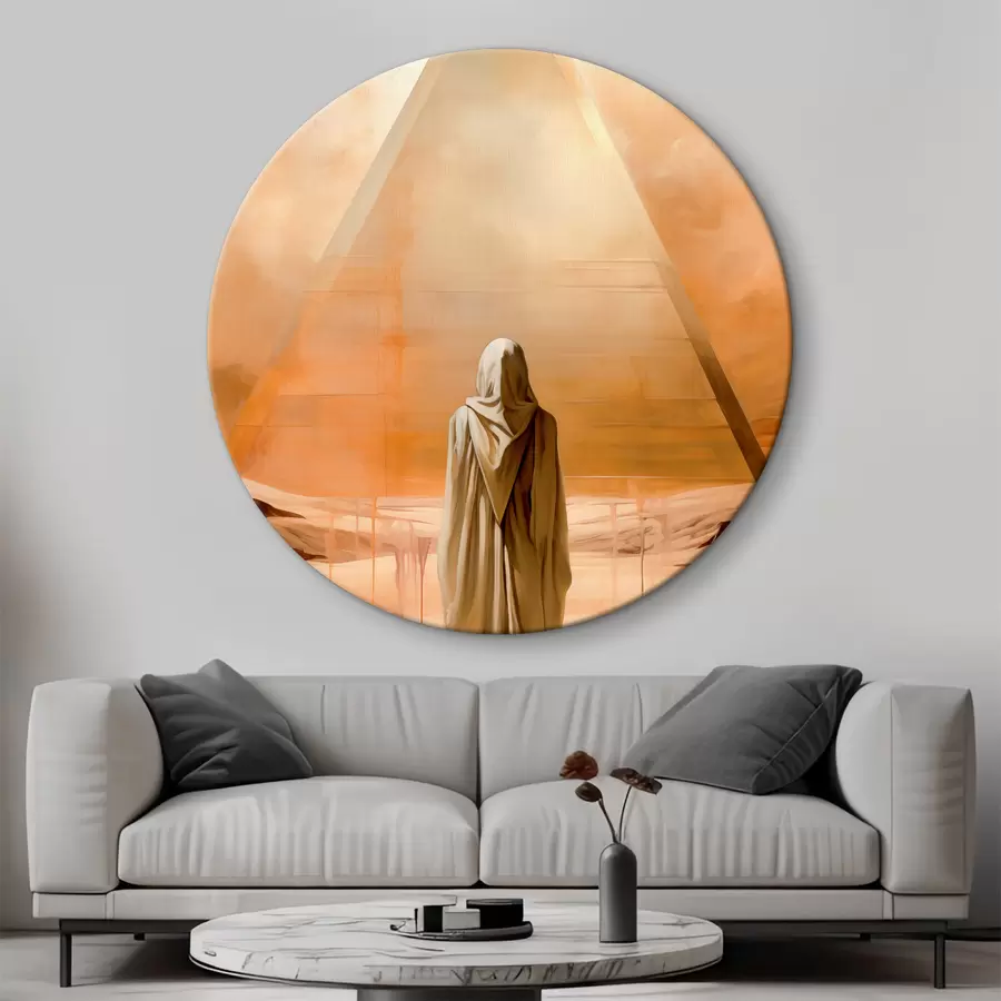 Vyro baltu apsiaustu su gobtuvu siluetas piramidės fone dykumoje