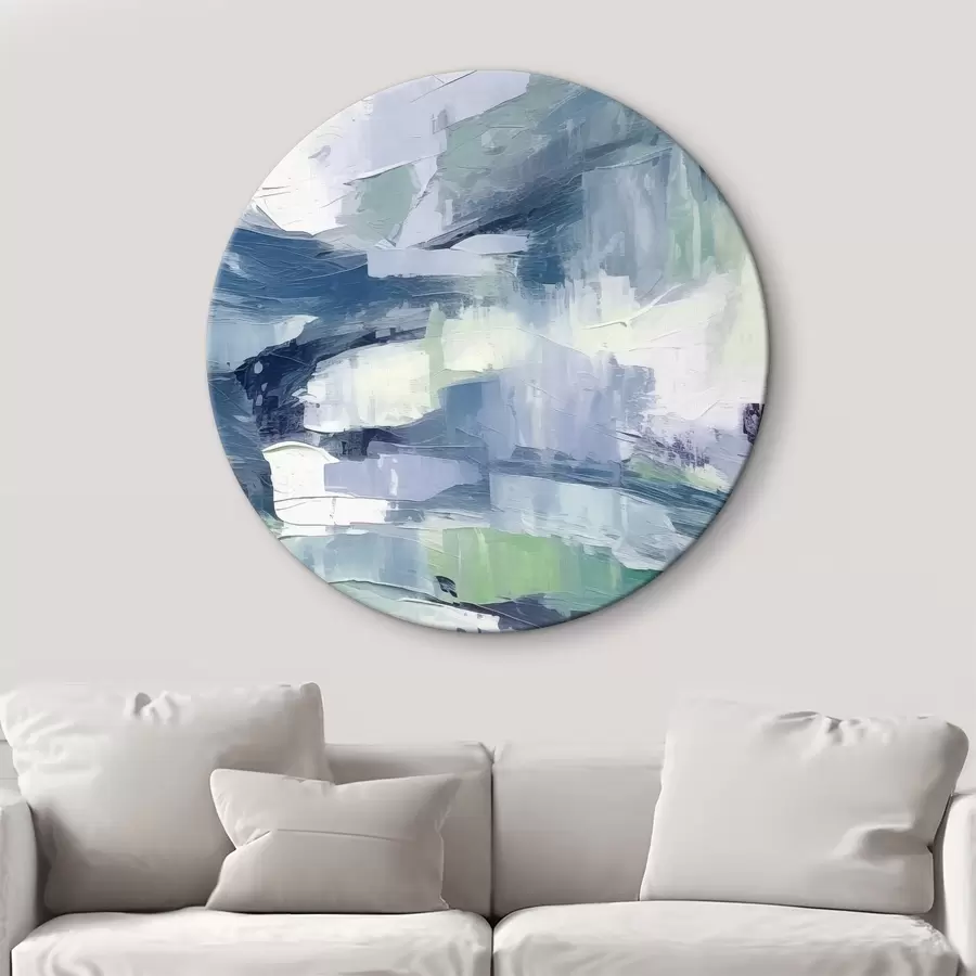 Nulupti dažai su baltos, mėlynos ir geltonos spalvos sluoksniais sukuria abstraktų, tekstūrinį atspaudą