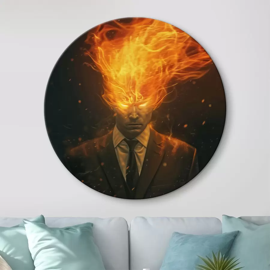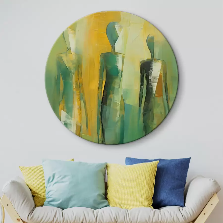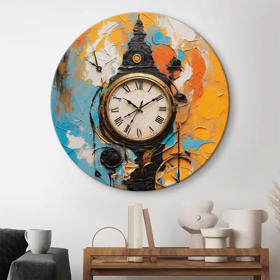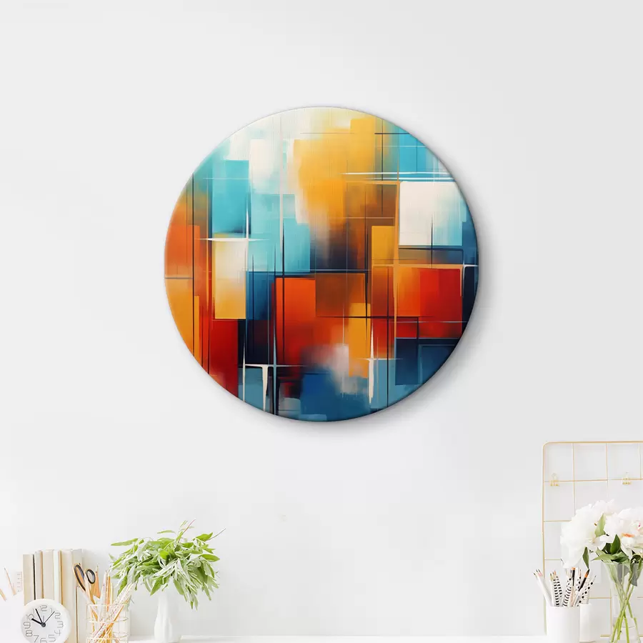 Abstrakčios geometrinės formos mėlynais, oranžiniais ir rudais atspalviais sukuria modernią, minimalistinę kompoziciją.