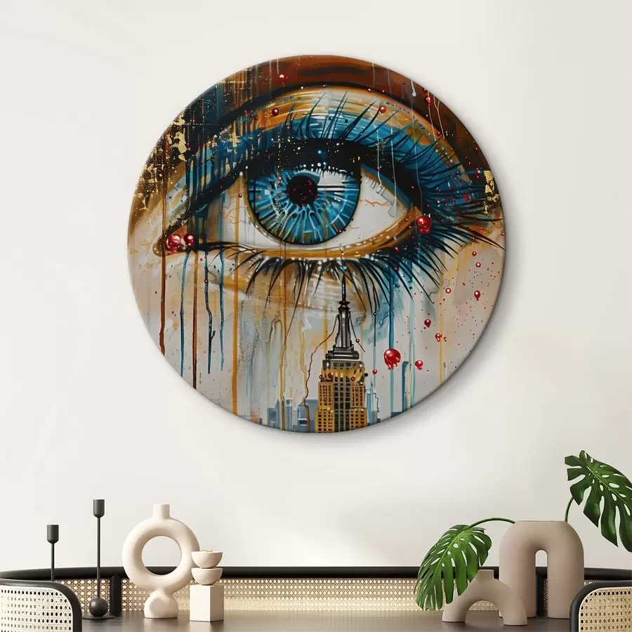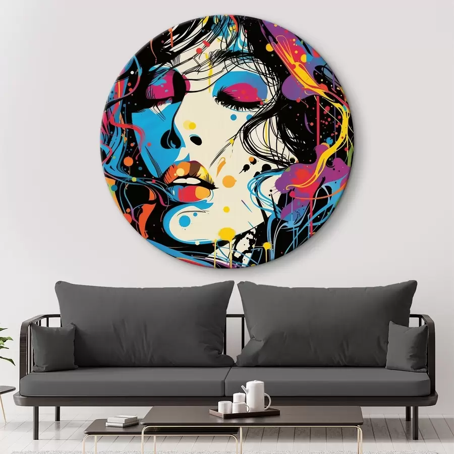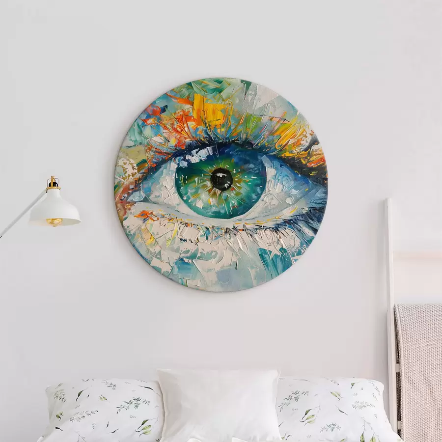 Mergaitės portretas fone su akimis ir abstrakčiais potėpiais
