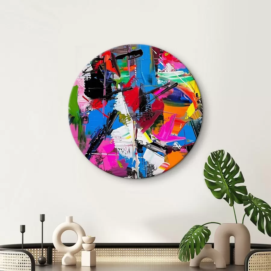 Chaotiška dinamiška geometrinė abstrakcija, mėlyna, raudona, geltona