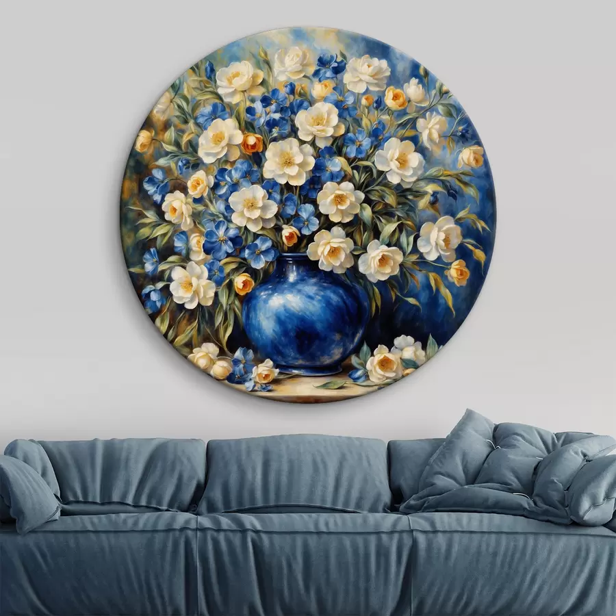 Mėlyna vaza su didele baltų ir mėlynų gėlių puokšte