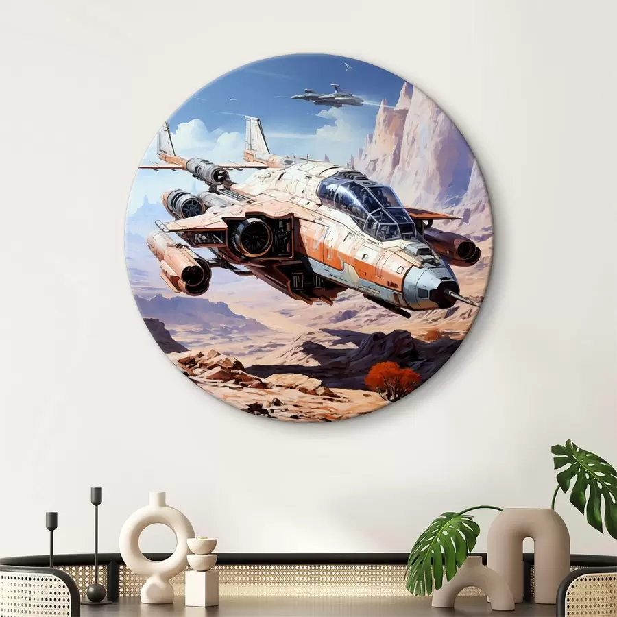 Kiberpanko stiliaus erdvėlaivis skraido tarp kalnų ir debesų, mėnulio kraštovaizdžio, mėlynos, smėlio spalvos, baltos spalvos