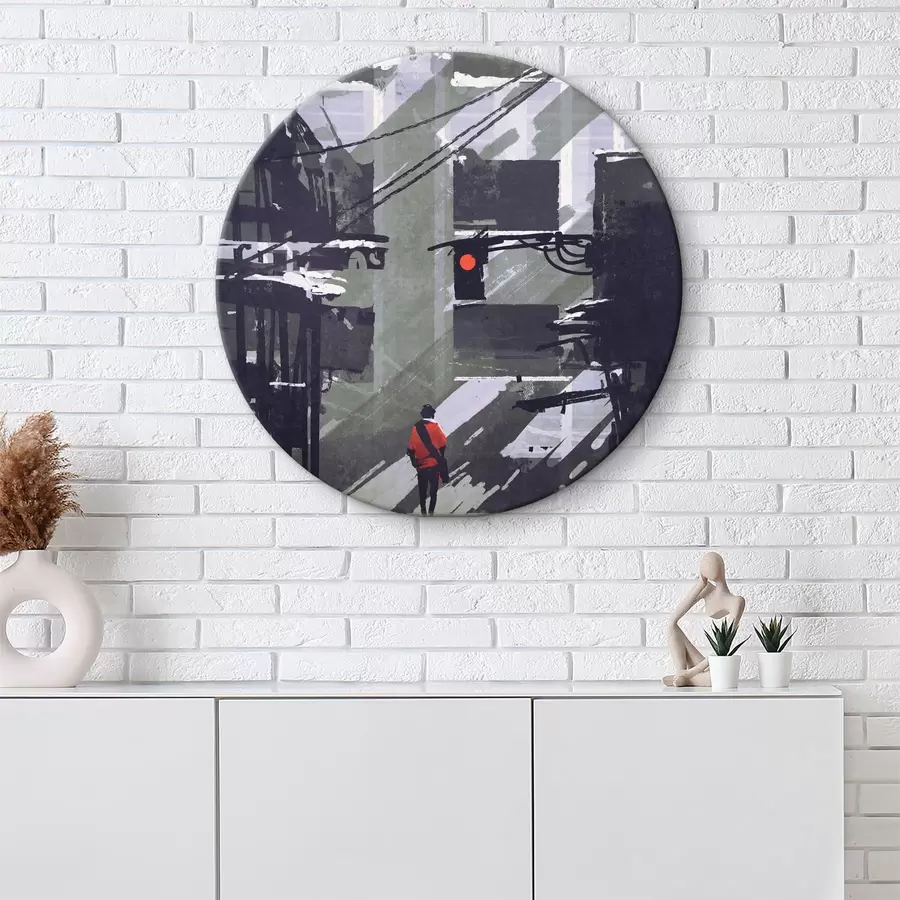 Akvarelė, vaizduojanti gatvę su pastatais ir aukštu bokštu fone