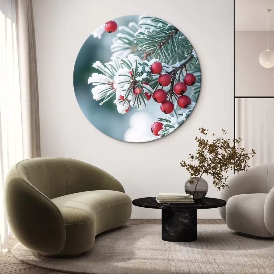 Snieguota pušies šaka su raudonomis uogomis , žiemos scena
