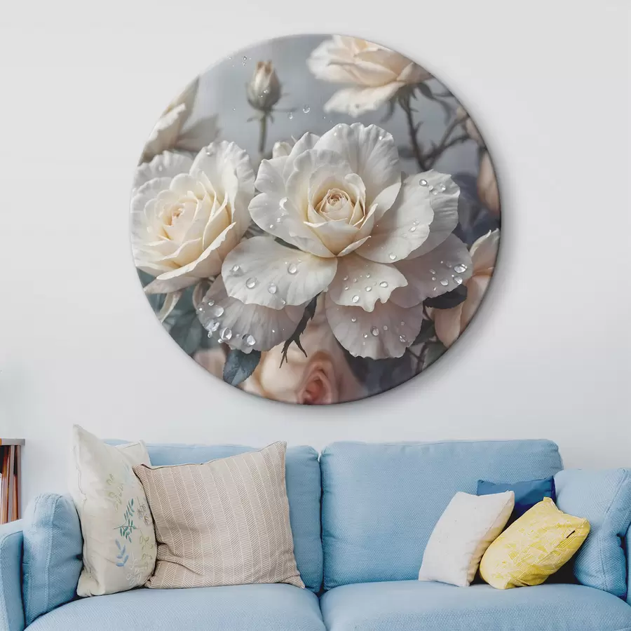 Grupė baltų rožių su vandens lašais ant žiedlapių, keletas žalių lapų, prislopintas fonas, švelni šviesa
