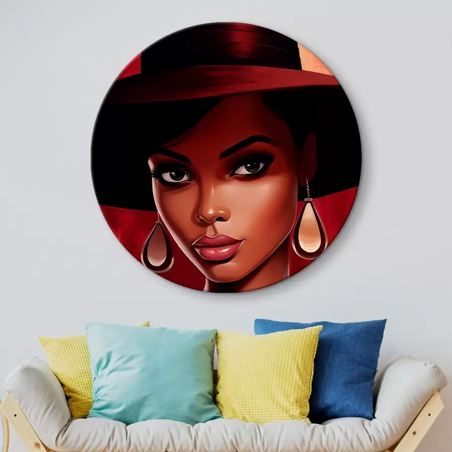 Moteris su šviesia skrybėle ir apvaliais auskarais