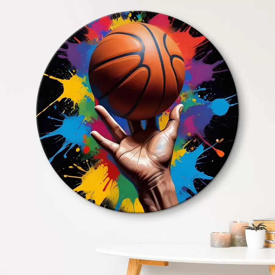 Ranka, laikanti krepšinio kamuolį spalvingame dažų taškymo fone