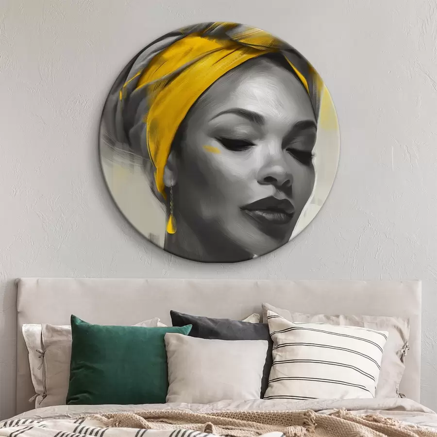 abstraktus juodai baltas moters portretas afrikietišku stiliumi geltonais dažais