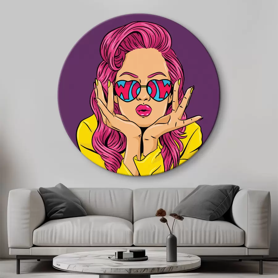Animacinis plakatas su mergina su akiniais violetiniame fone