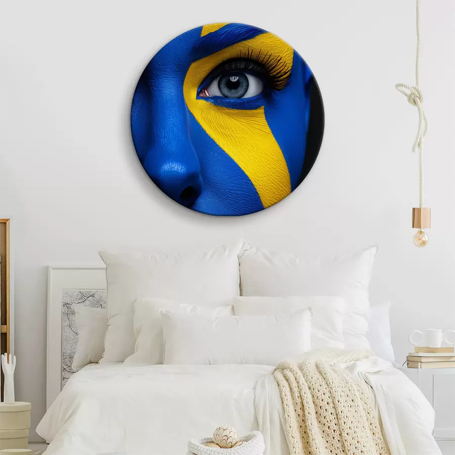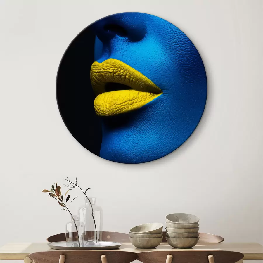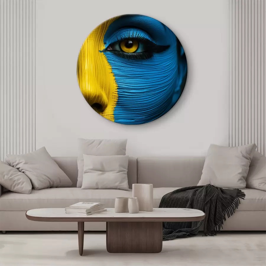 Ryškiai geltonas ir mėlynas gražaus merginos veido minimalizmas