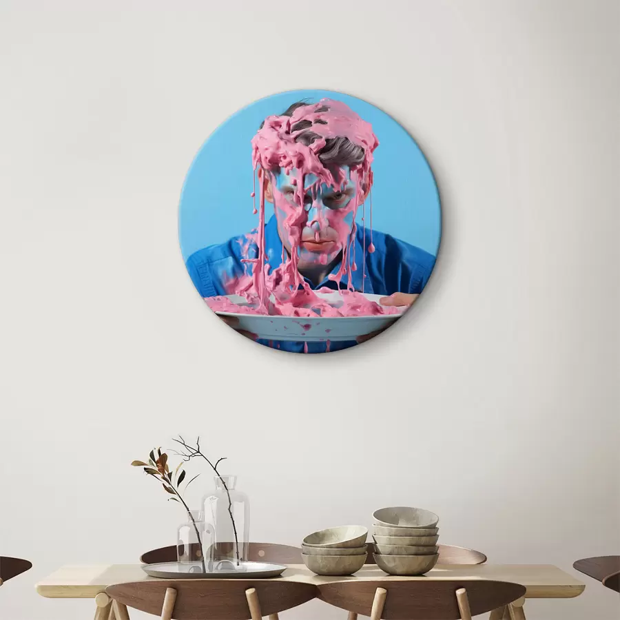 Vyras mėlyname fone mėlynais marškiniais, padengtais rožiniais dažais
