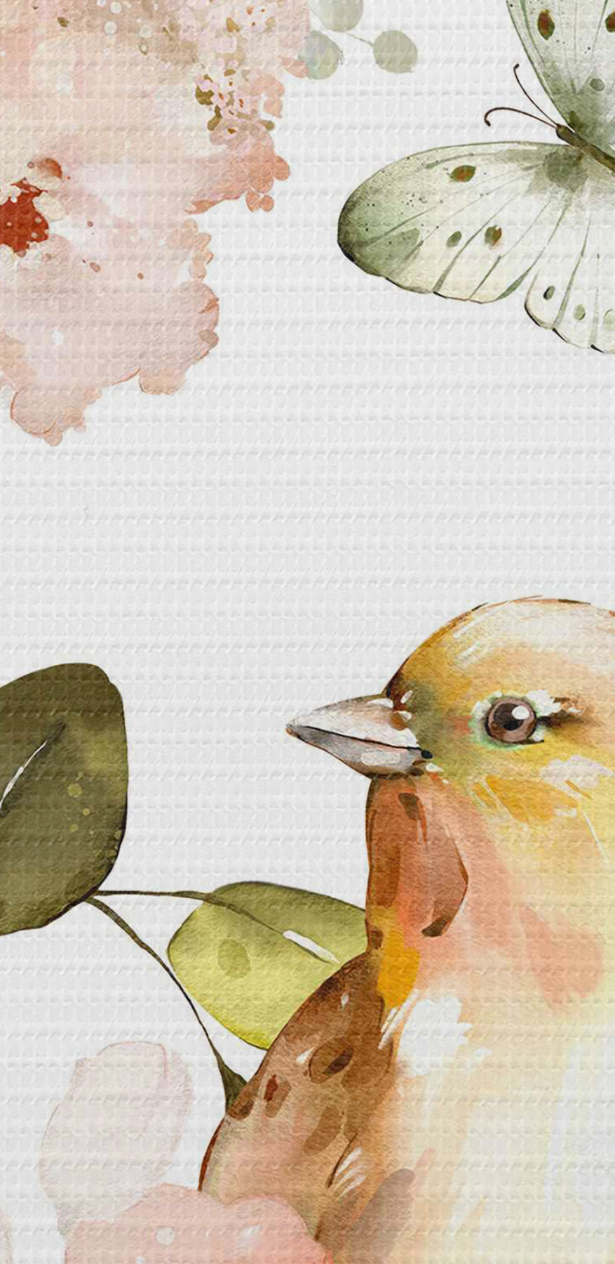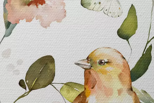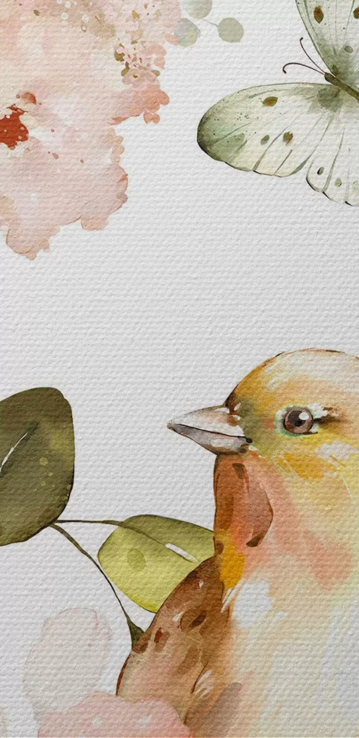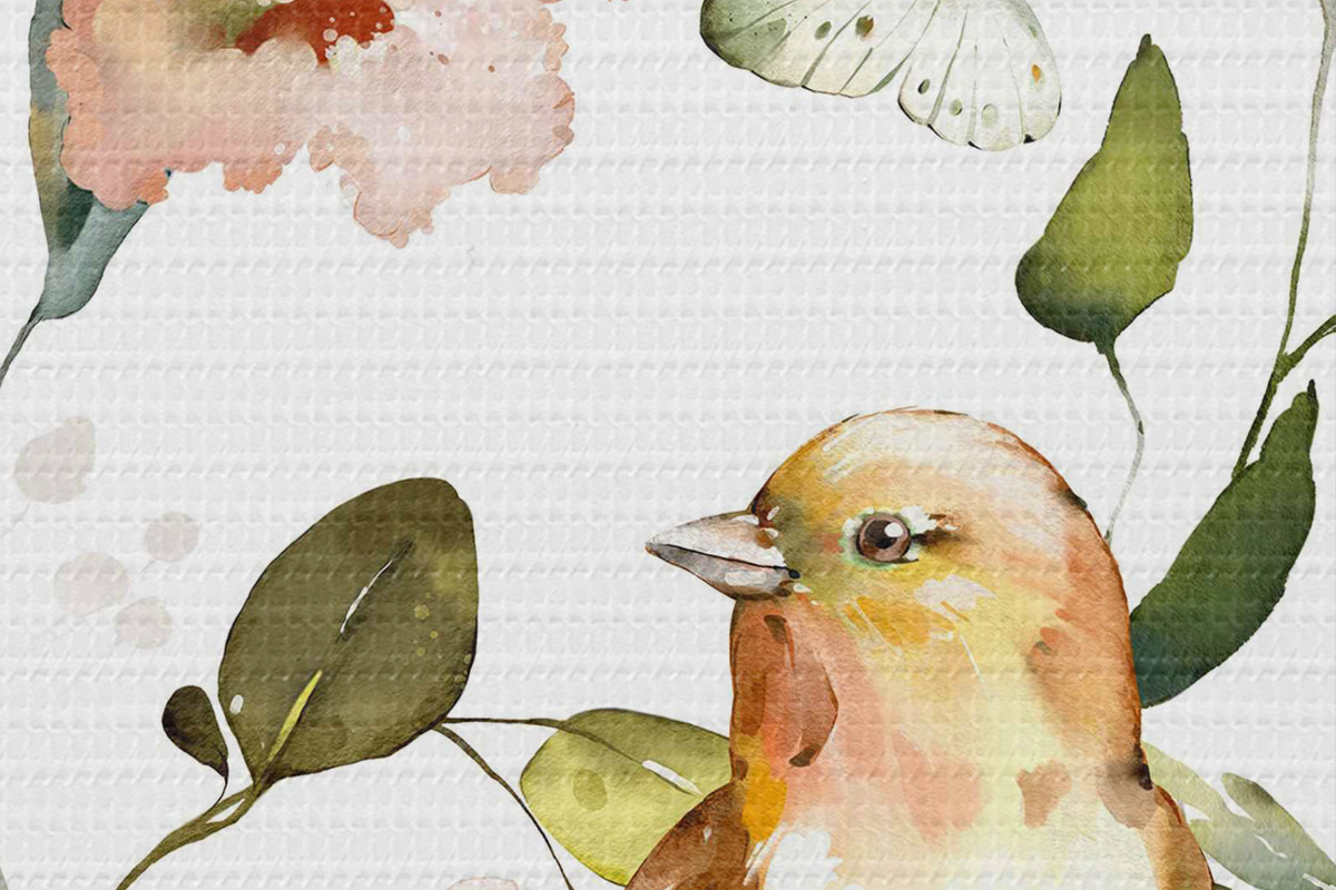 Nuotrauka Akvarelė, vaizduojanti gėles, paukščius ir drugelius baltame fone Nr r36153