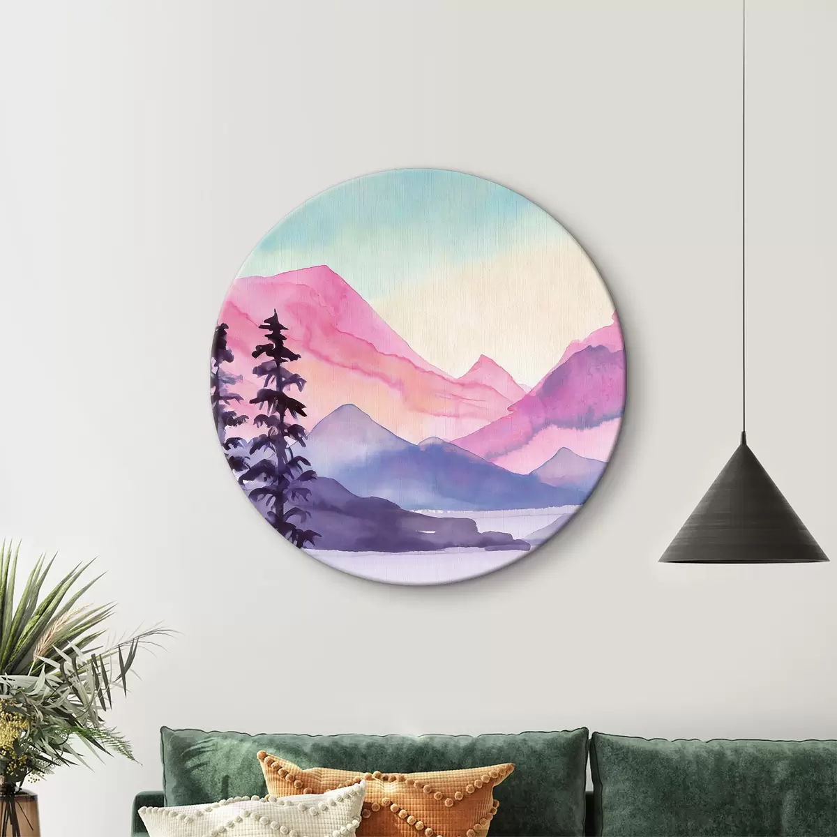 Nuotrauka Akvarelė Kalnų kraštovaizdis, saulėtekis, minkštos violetinės, rožinės ir mėlynos spalvos Nr r36496