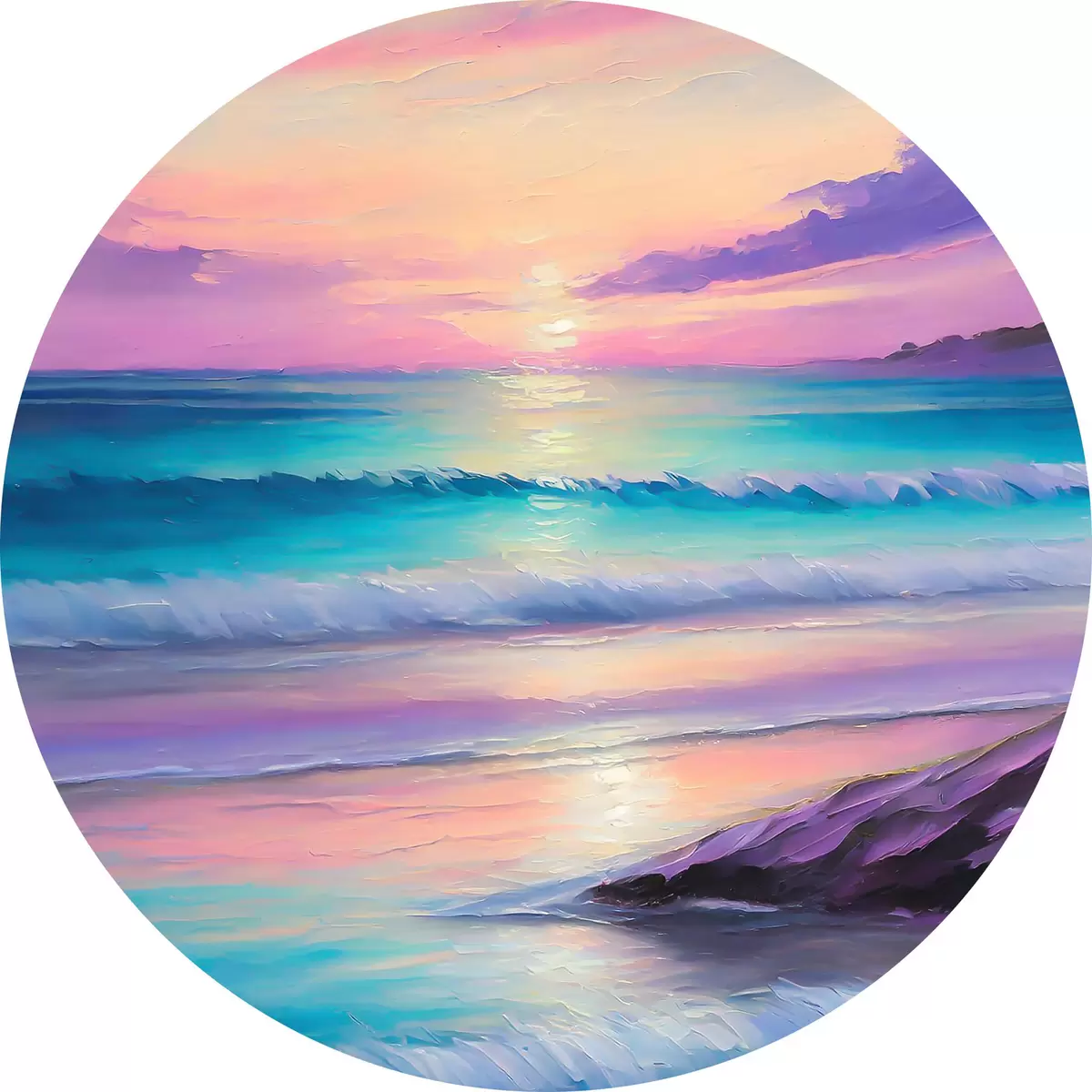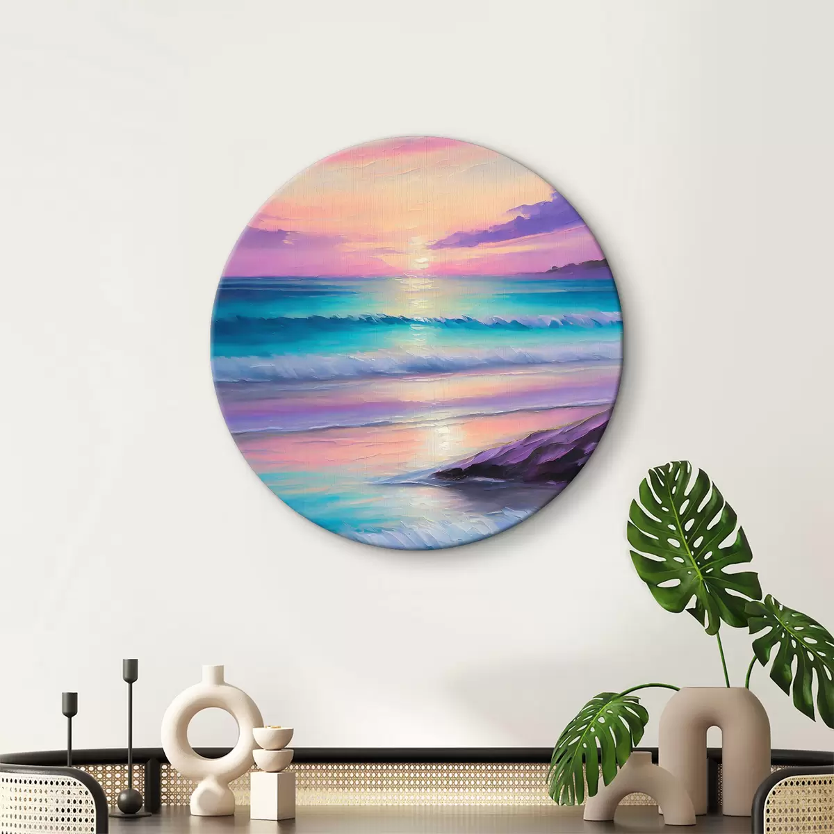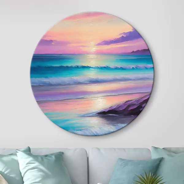 Nuotrauka Švelnus violetinis saulėlydis jūros pakrantėje, akrilo piešinys, jauki paplūdimio atmosfera Nr r36590