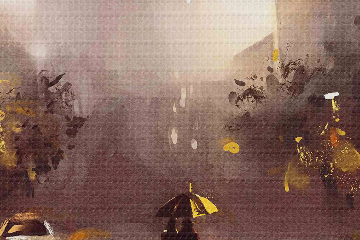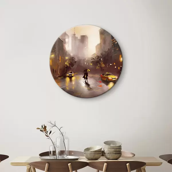 Nuotrauka Asmuo su skėčiu, einantis šlapia gatve su automobiliais ir pastatais Nr r36600