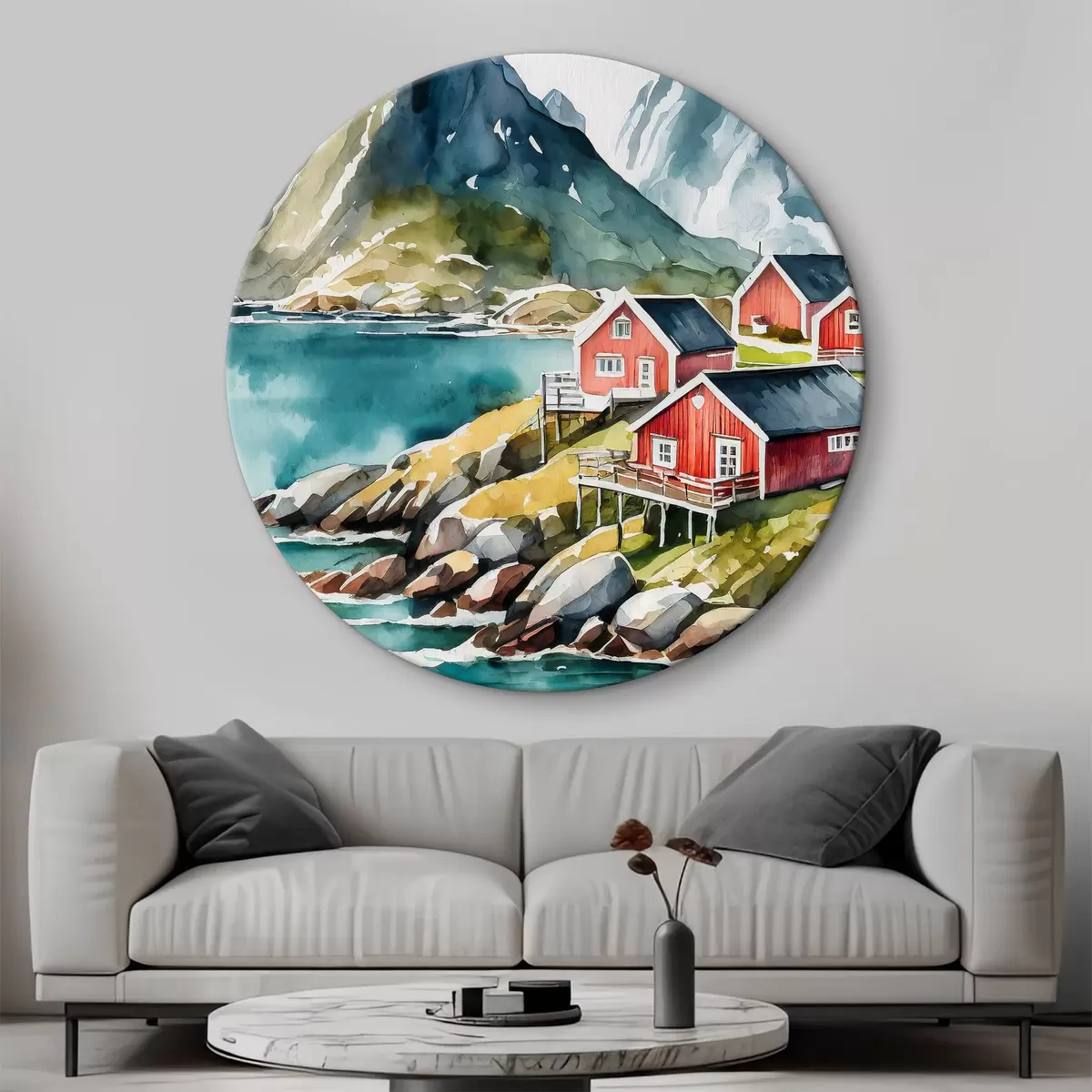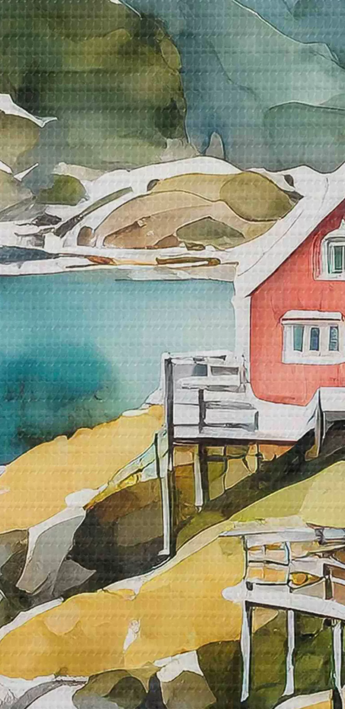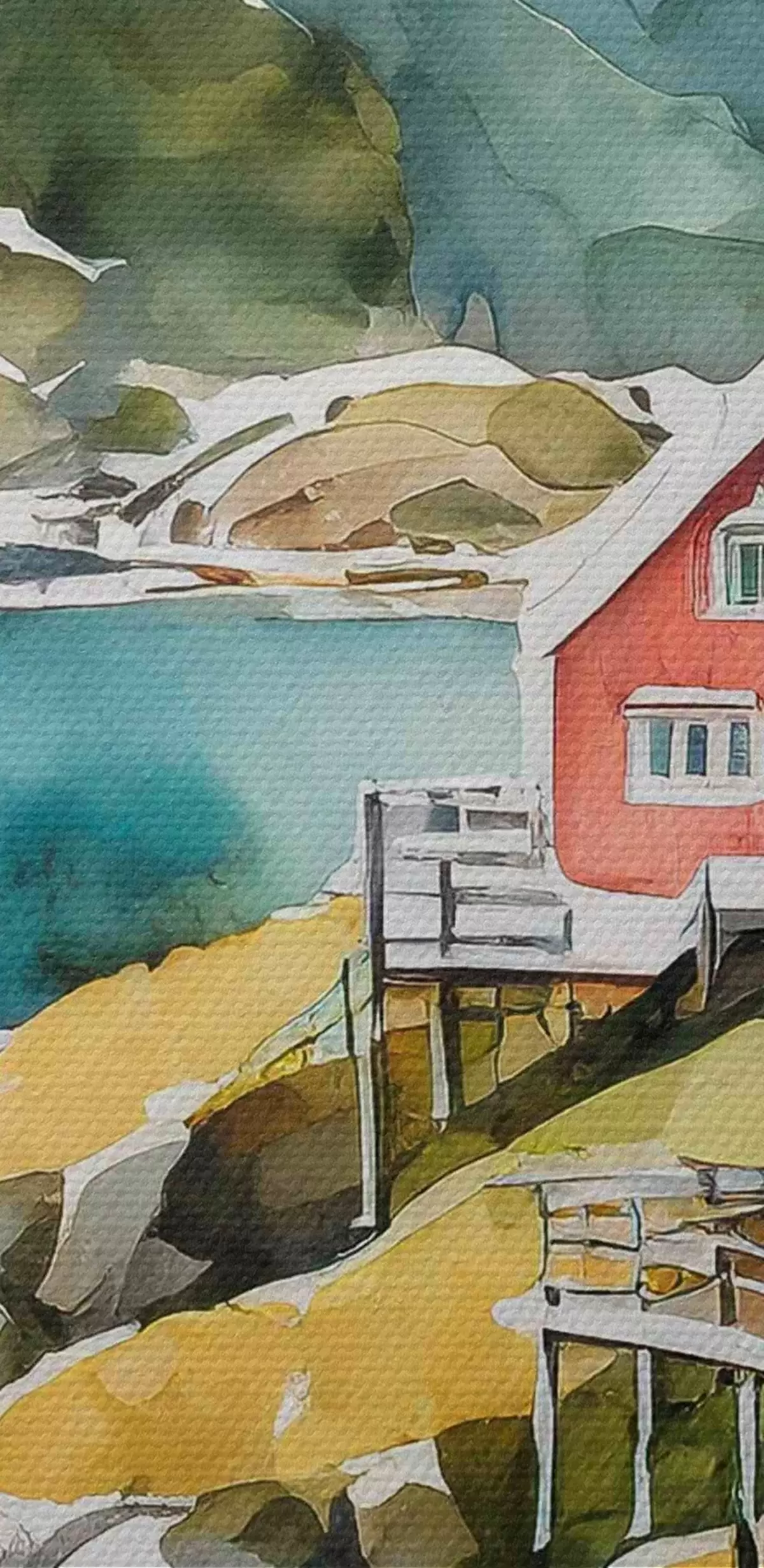 Nuotrauka Akvarelė, vaizduojanti namus ant kalvos šalia vandens telkinio Nr r36678